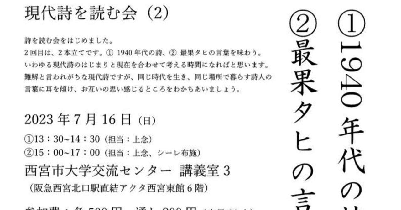 参加者それぞれが自分の「推し」の詩について語り、それについて少しみんなでコメントするという形。7人が11編を語って3時間があっという間だったので、詩について語るって時間を忘れるなと思った次第。