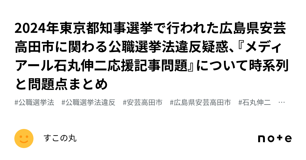 ①この問題は、2024年東京都知事選挙の選挙運動期間中であるにも関わらず、メディアール(Mediall)という地方創生メディアに #石丸伸二 を応援する記事が掲載された問題(公職選挙法違反疑惑)… https://t.co/PKCC1uuu7j