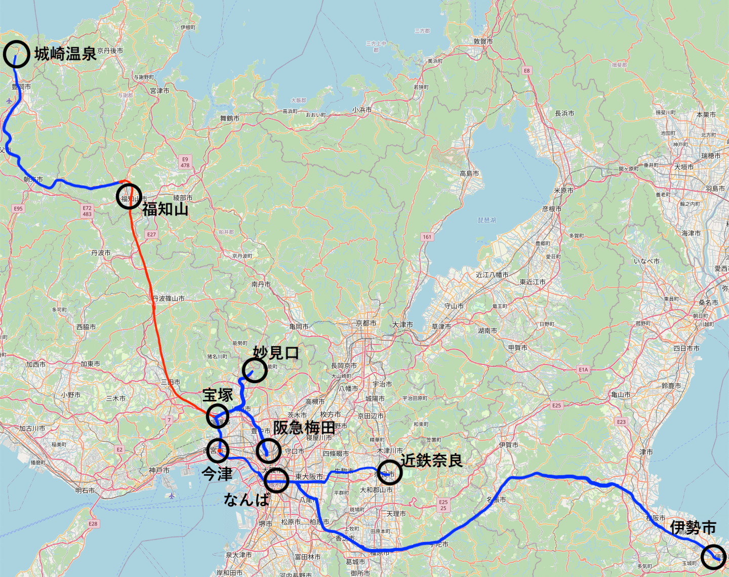 少しでも多くの利用者が恩恵を受ける形というのはつまり、阪急梅田や妙見口のみならず近鉄奈良や伊勢市などの様々な場所から城崎温泉まで直通のミニ新幹線を走らせるということで達成するのです。そうですね、「城崎温泉発の近鉄奈良行き」や「福知山発の名張行き」などが設定できそうです。(図1のネットワーク)
