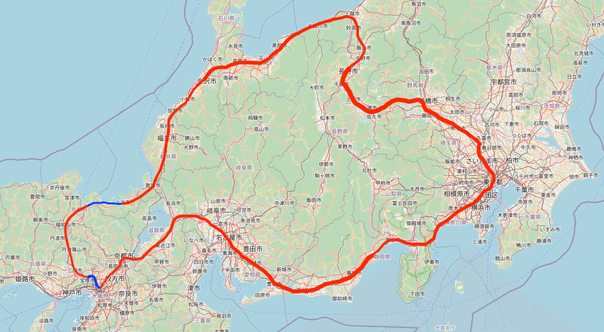 それに加えて、阪急宝塚線の三国駅から新大阪駅西側の車庫へのアプローチ線を建設すれば、東海道新幹線の東京方面への乗り入れもできます。すると、以下のような正真正銘の環状の新幹線が出来上がりますね。