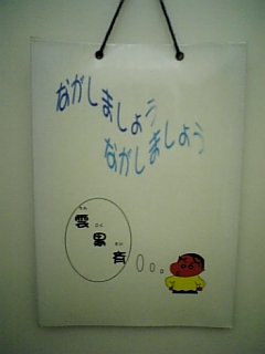 流しましょうさすがにね、ちょとへヴィーだったかな昨日。 とか思い立ち、面白いものをアップしてみます。 なんとも言えないくだらなさでしょ。 オフィスの入っている建物のトイレのドアの内側には、すべてこれがかかっています。 今ごろクレヨンしんちゃんって・・・ まだテレビでやってるのかな? 雲黒斉って、なんだか悪者だったよね。 ちょっとお下品なしんちゃんが、こんなところにいるのです。 いっつも気になりつつ、誰にも事の真相を聞けないワタクシ。 作った人の意図が知りたい・・・ いや、分かるんだけど、なぜこれなのさ?