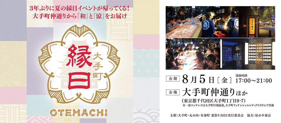 大手町縁日体験版2022大手町縁日 2022 「大手町縁日 2022」開催!! | Marunouchi.com大手町エリアの夏の風物詩が3年ぶりに復活!「星のや東京」とコラボレーションした“大人も楽しめる縁日”8月5日(金)に、3年ぶりに「大手町縁日 2022」を開催します!6回目の開催となる今年は、名物コンwww.marunouchi.com2022年8月5日(金)17:00〜21:00大手町仲通り、大手町川端緑道、大手町フィナンシャルシティ1階アトリウム住所:東京都千代田区1