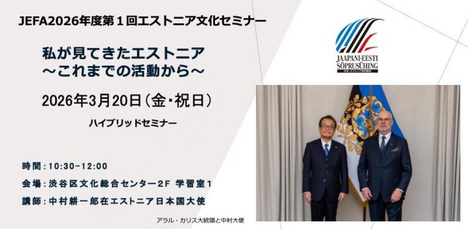 日本・エストニア友好協会 第1回エストニア文化セミナー 3月20日開催 ハイブリッド開催です。 3月20日 渋谷+オンライン 中村エストニア大使のセミナー。 お申込み詳細は こちら 【ハイブリッド開催】日本・エストニア友好協会/JEFA 2026年度 第1回エストニア文化セミナーJEFAエストニア文化セミナーが始まって16年目の2026年が始まりました。 様々なテーマでエストニアを深掘りしてきましたが、今回は現役在エストニア日本国大使の 一時... powered by Peatix : More than a ticket.jefa0320.peatix.com