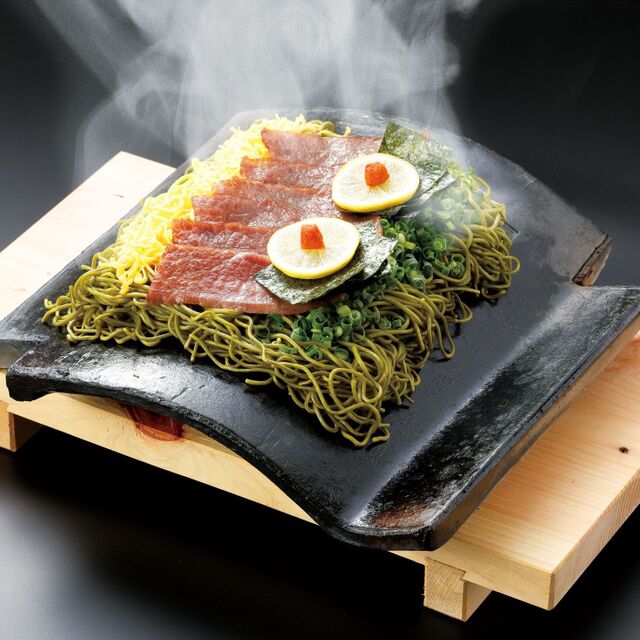熱々の瓦の上に、茶そばが乗っているから、下の方がぱりぱりしている!!