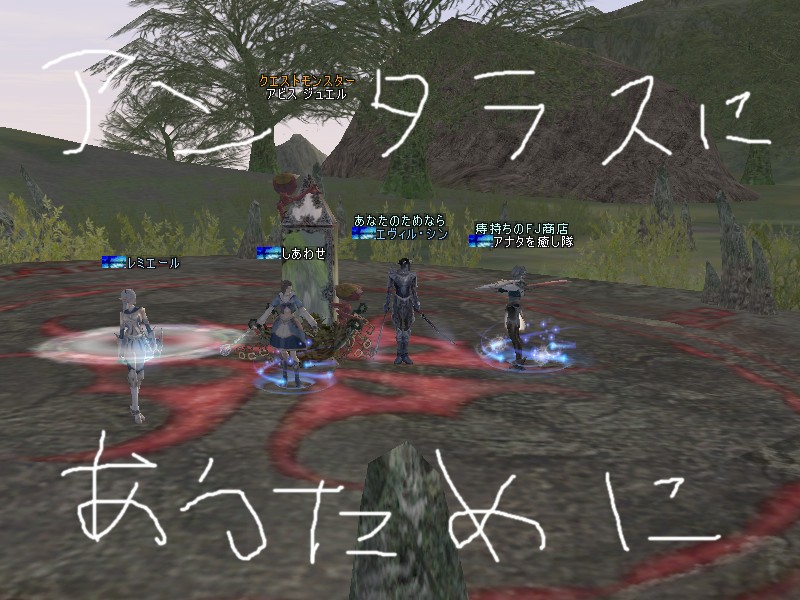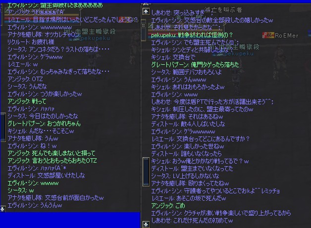 必死になって交感台の上の敵をクリックし、隣のディスさんやキシェさんと攻撃をしまくる。俺ももちろん攻撃にあったけど、ラヴィさんとしゃっくーのヒールで死なずにすむ。WIZの面々も周りのPCを攻撃して遠くから援護。そして次の瞬間。