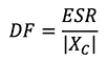 誘電効果は、コンデンサにAC信号が印加されたときに発生します。AC電圧によって誘電体が分極し、内部過熱を引き起こします。誘電過熱は誘電体材料によって決まり、誘電体の誘電正接として測定されます。誘電正接(DF)はコンデンサの静電容量とESRの関数であり、式2で求められます。