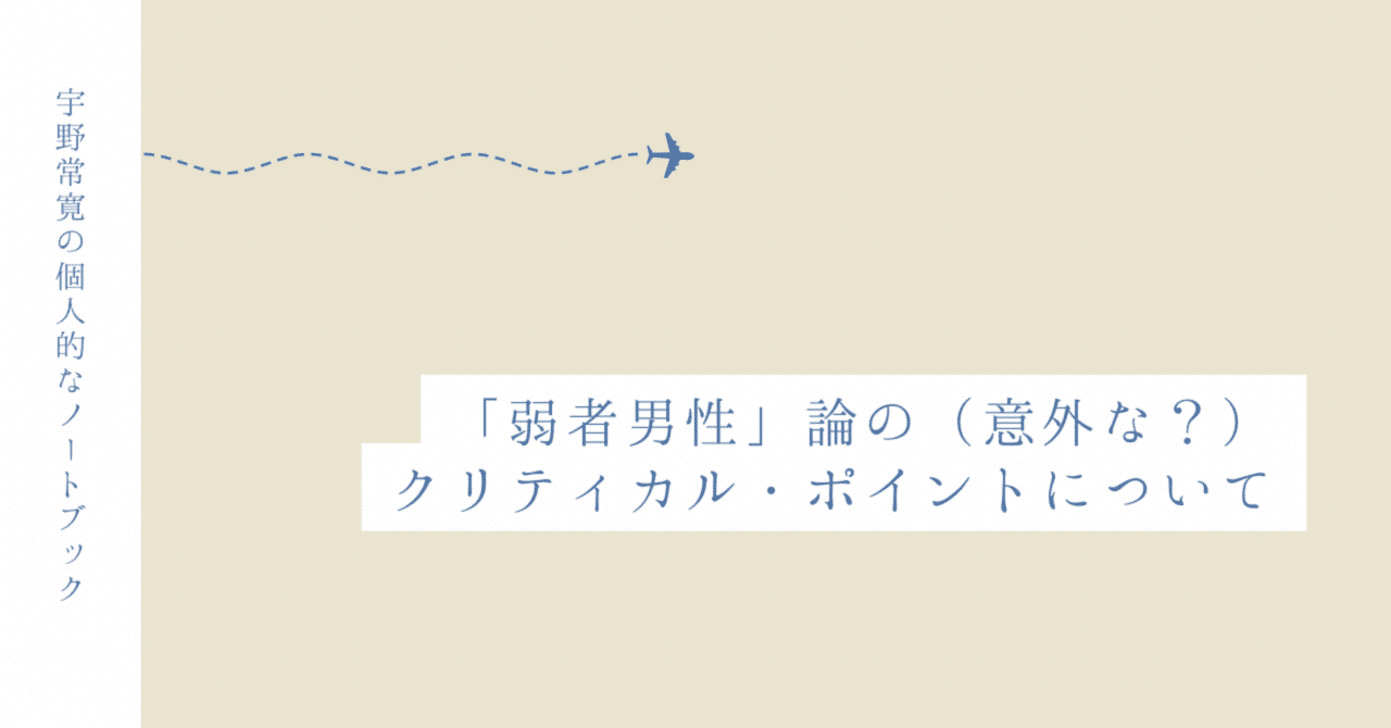 宇野さんみたいに本質的に強い男性は、NHKにようこそ!の佐藤君や村上春樹の小説に出てくるような男性を弱いし、つまらないと一蹴できるし、新しい何かを生み出す事が出来るのだけれども、私が付き合って来たのは、白石君や佐藤君や村上春樹信者のスガシカオ的世界観の男性であって、彼らを見放したり、可哀想、弱者とするべきでも無いと思う。