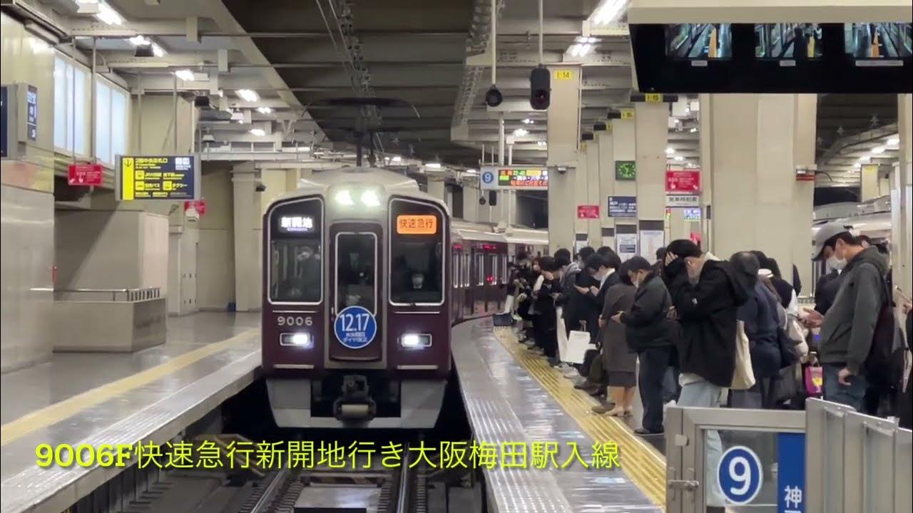阪急神戸線大阪梅田発22時40分の快速急行新開地行きは9006Fダイヤ改正ヘッドマーク付8連で運転されていました。