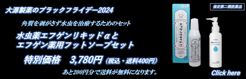 毎年この時期だけに販売される商品で、一押し商品でもある「水虫薬エフゲン60ml3本セット」です。定番商品ではないので、この時期を含め、年に数回しか販売しない大特価商品です。買わない手はありません。