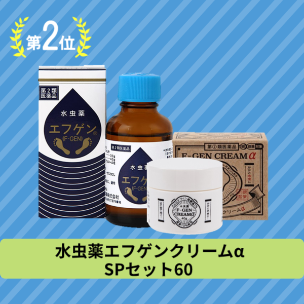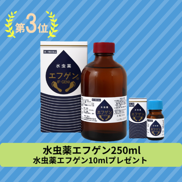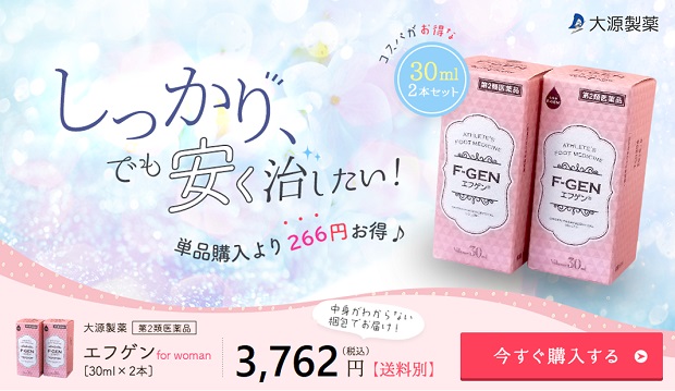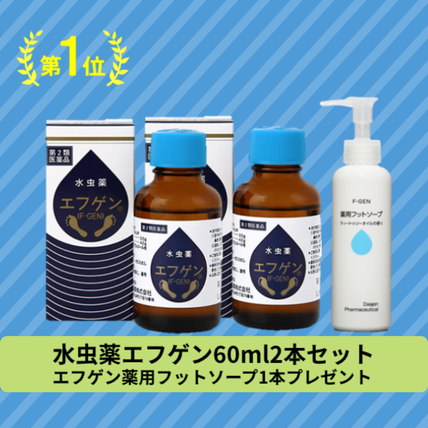 今なら水虫薬エフゲン60ml2本セットを買うと、1個プレゼントとして付けていますので、是非この機会にお買い求め下さい。