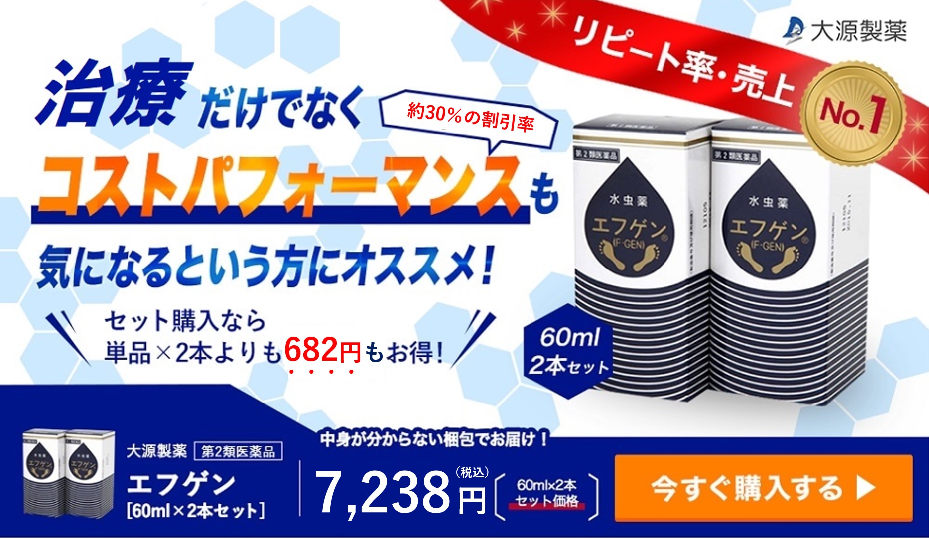 水虫薬エフゲンを用いると痒みがスーっと引いていきますが、1週間ほどすると角質層が剥がれてきますし、皮膚を急激に乾燥させる作用がありますので、この時期のオススメは水虫薬エフゲンクリームαです。