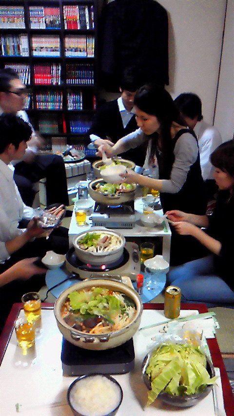 鍋パ会社の先輩のおうちにて 鍋5つ 総勢15名集合~ キムチ鍋・トマト鍋・もやし鍋・カニすき・もつ鍋 豚、牛、鶏をはじめベーコン、ウインナー、もつ、カニ、イカ、鯛、白菜、レタス、なすび、大根などなど…具材超いっぱい生牡蠣もあったしでもみんなお腹痛にビビってあんま食べてない…笑 おなかいっぱい楽しかった