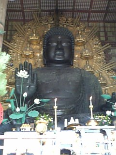 書いております!今日でプチライブツアーもLASTDAYS!今日は昼に奈良に入り4人で東大寺に観光に行って参りました!モリトモは寺や城が好きで、愛用カメラで写真をパシャパシャ撮りまくり、俺は鹿に服をムシャムシャ食べられ、ジンジンは大仏の鼻の穴と同じと言われている穴を修学旅行生を押しのけて潜り、お腹が引っ掛かっており!ヒロシは観光の外国人にカメラのシャッターをお願いされ、「OK,OK!ハイチウィ~ズとなんちゃって英語でシャッターを押しておりました」中学の修学旅行で来て以来の大仏でしたが、今改めてみるとかなり大きく、日本の文化に感心した!今日の画像は見ての通り大仏君!LOVEの振り付けにどう?