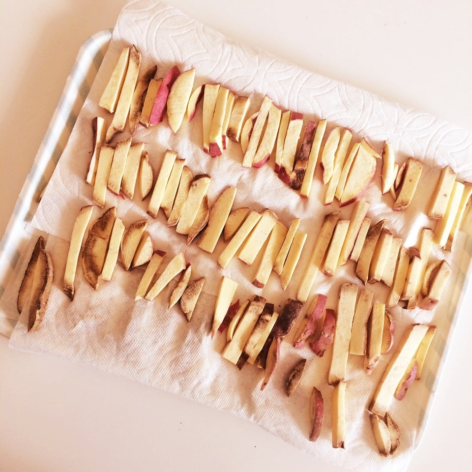 ❶サツマイモを同じ大きさになる様、細長く切る。