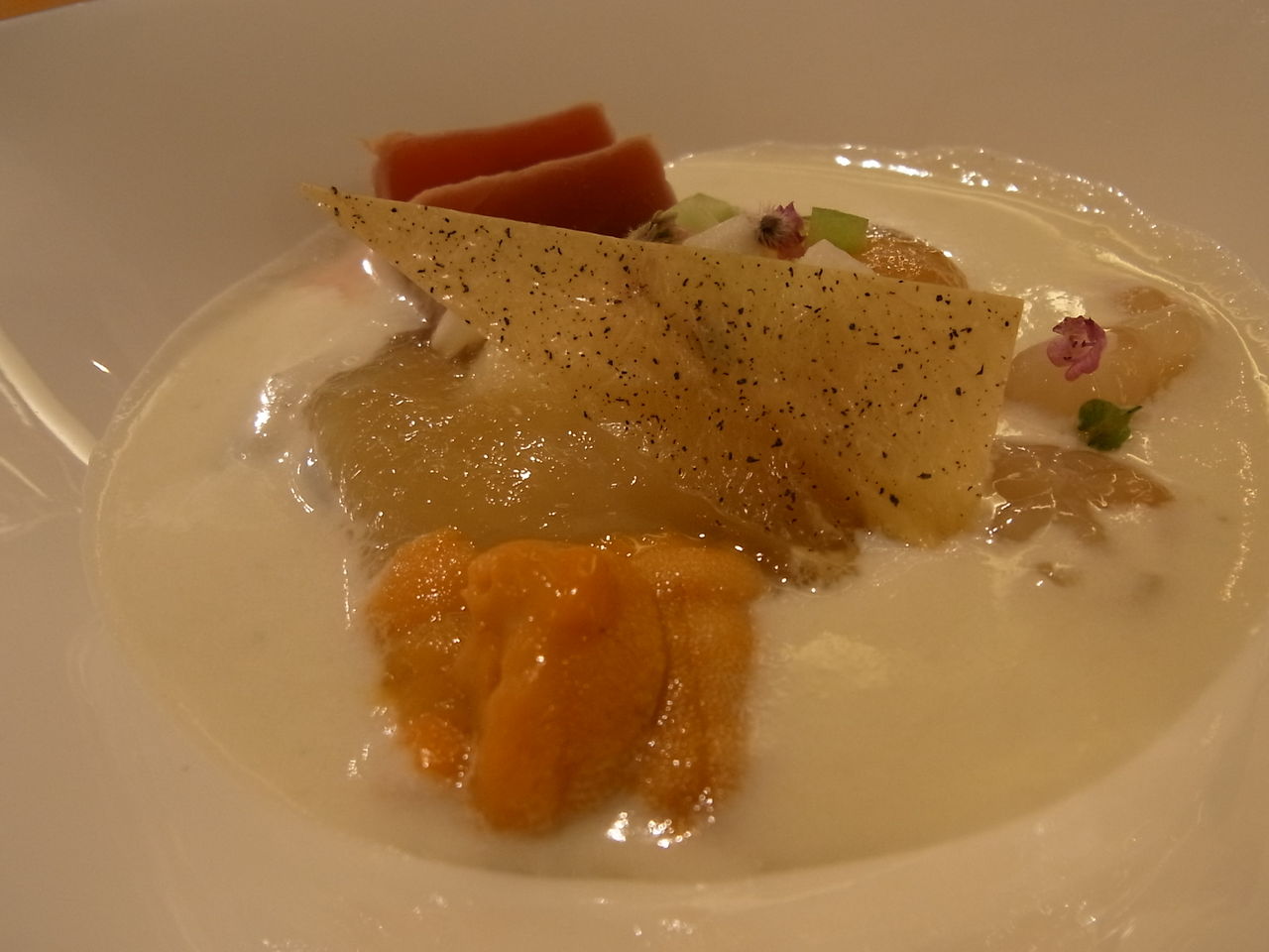 【鮪・生雲丹・ボタン海老・柔らかな卵と冷製スープ仕立て 海老風味のジュレと西洋山葵の香り】
