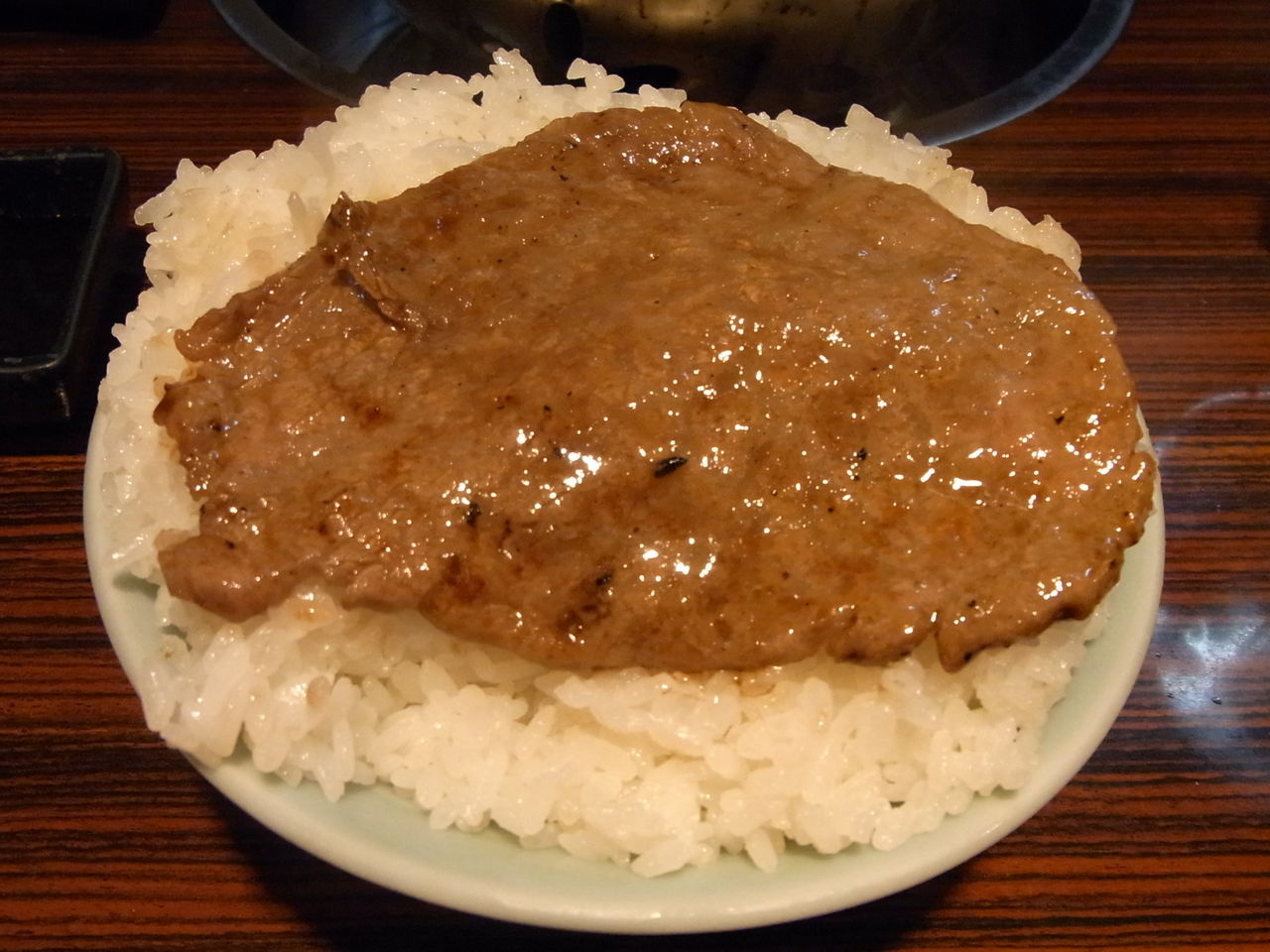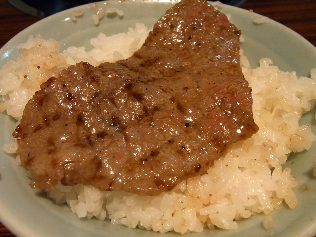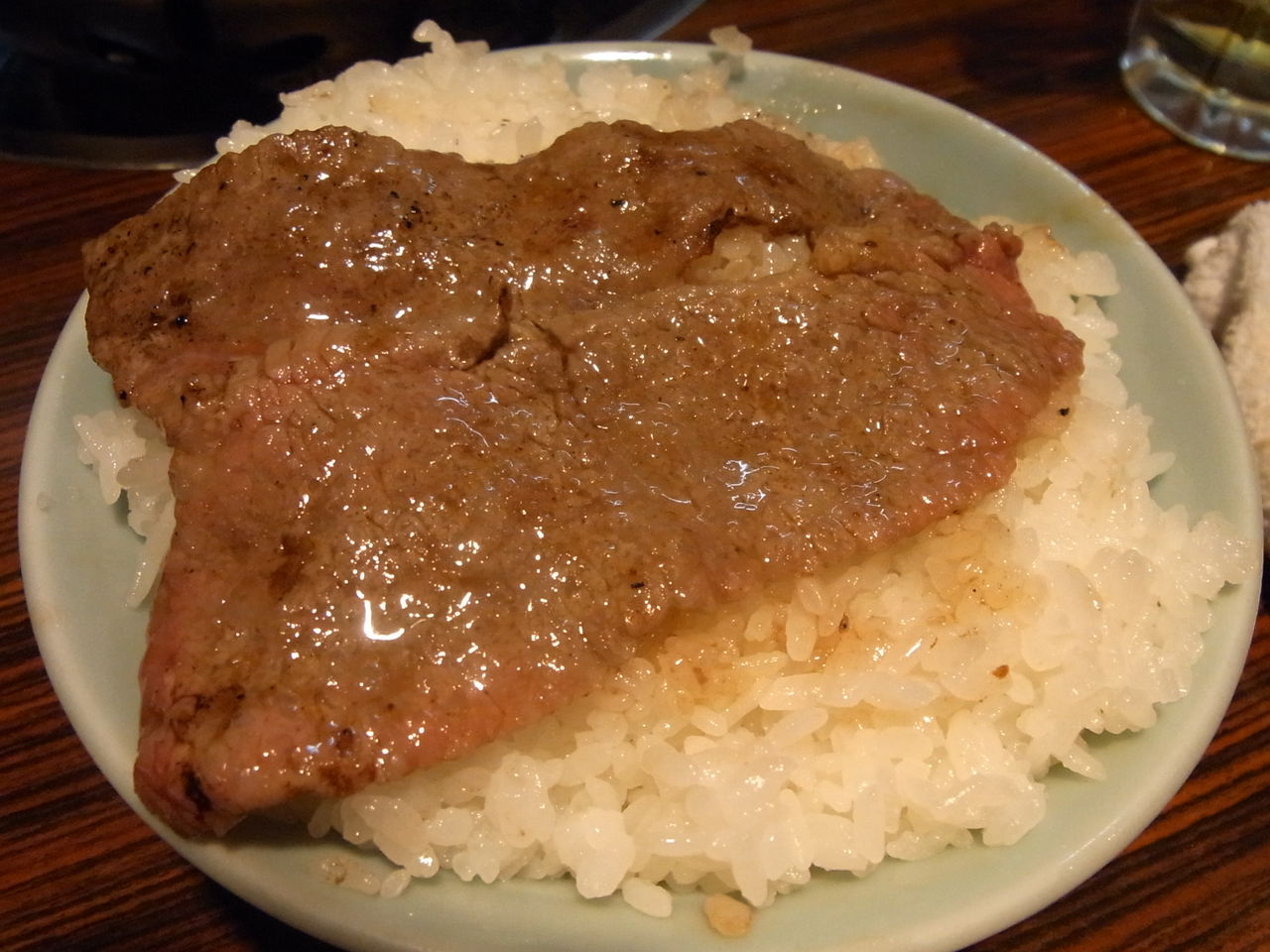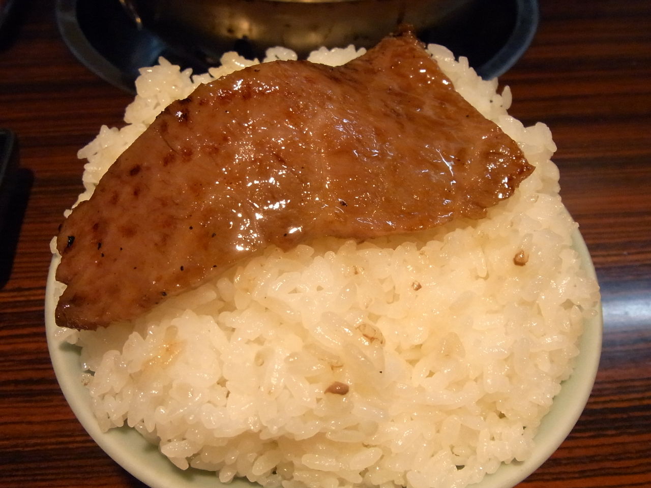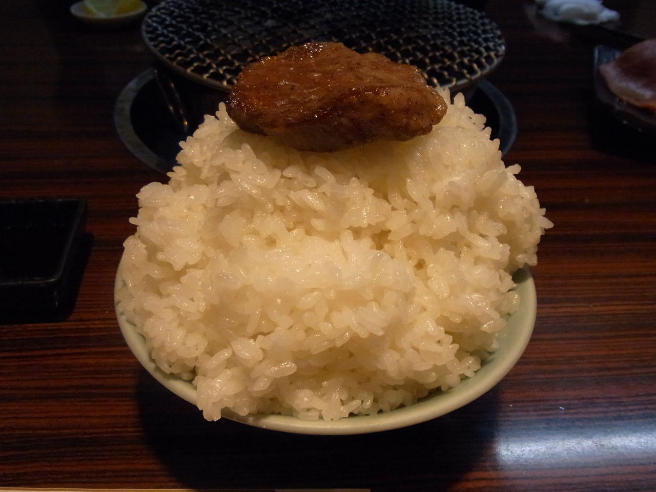 炎で艶やかなアブラ汗をかいてきたら、とりあえずライスの上にザブトン敷きつつ・・・