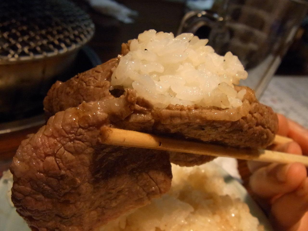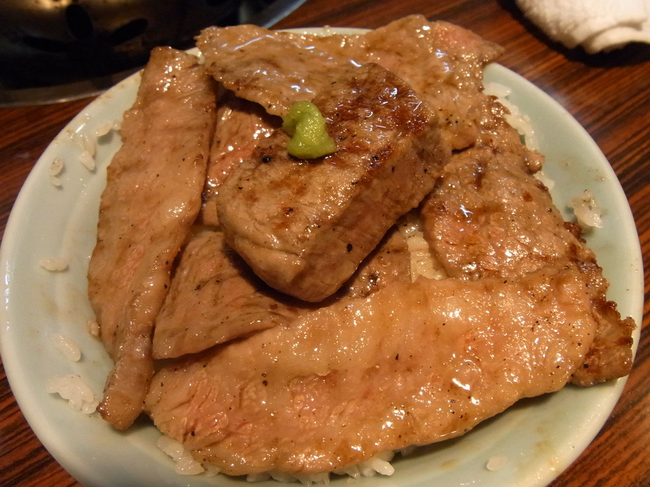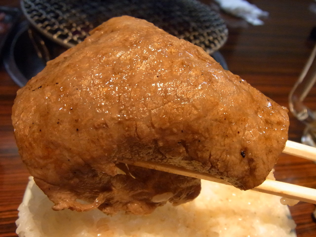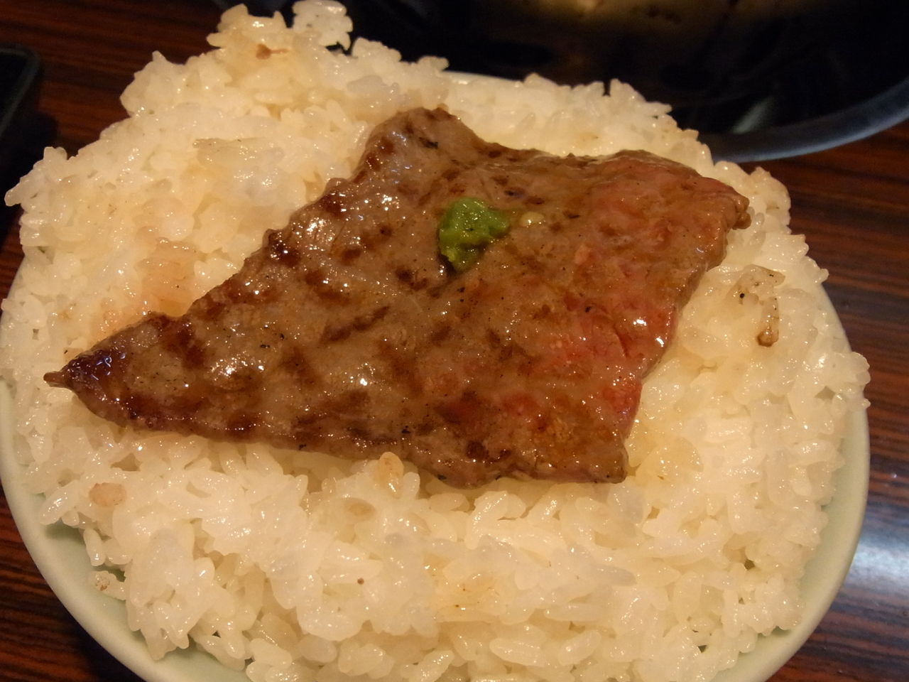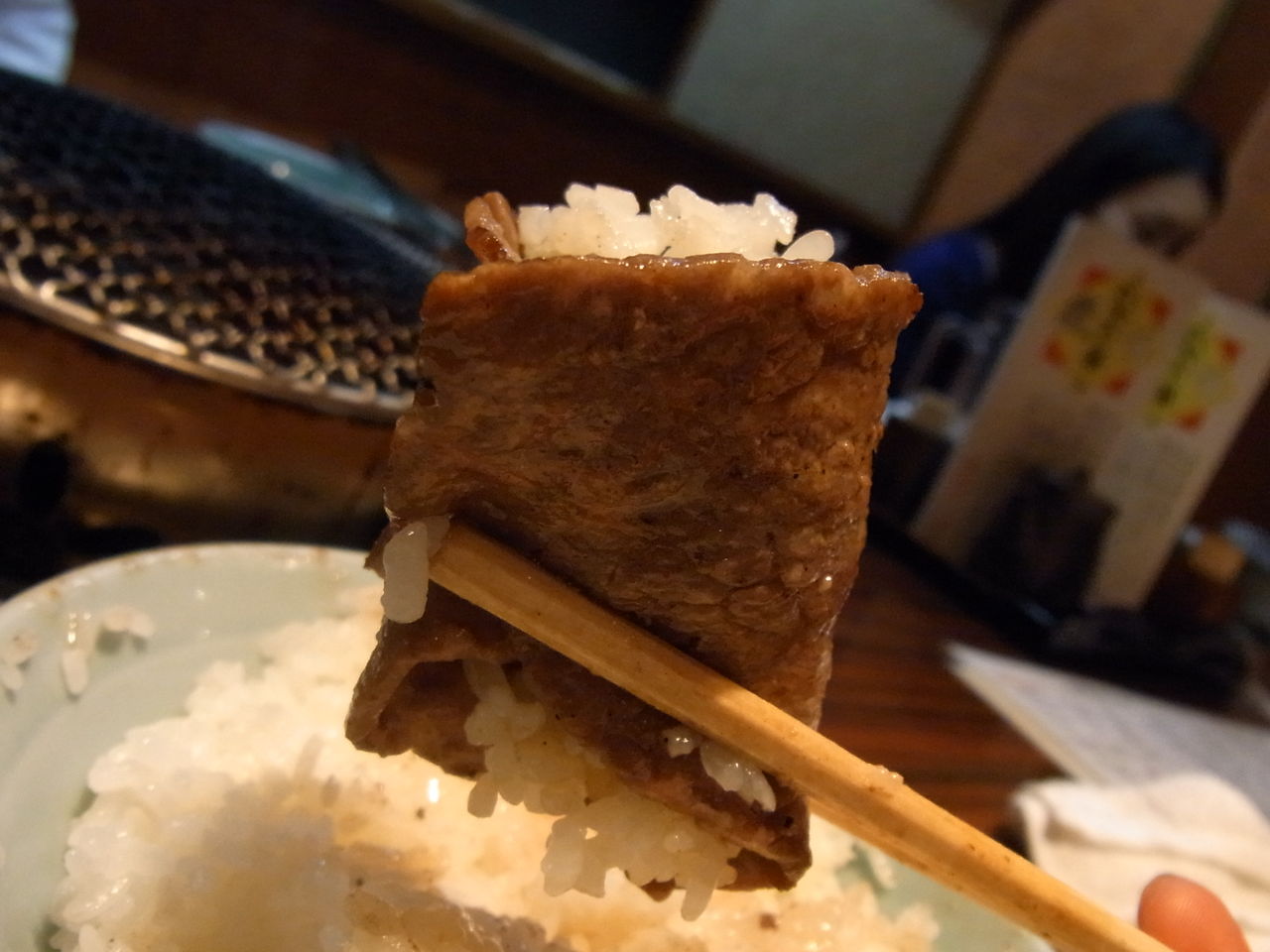炎で艶やかなアブラ汗をかいてきたら、とりあえずライスの上にザブトン敷きつつ・・・