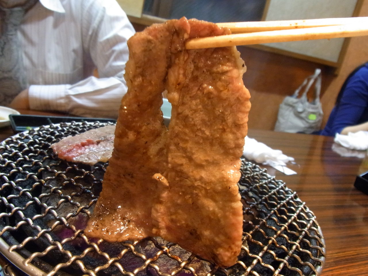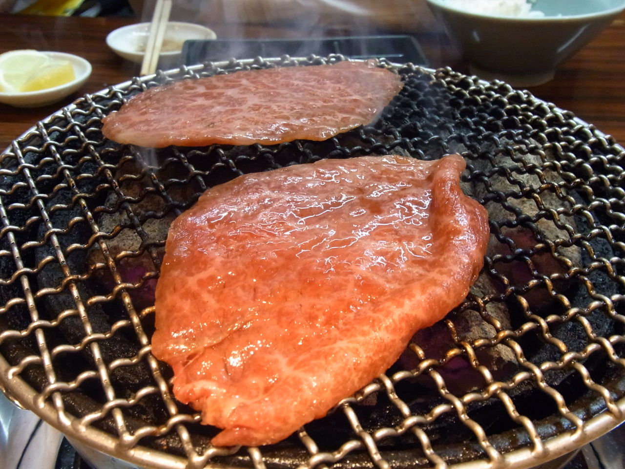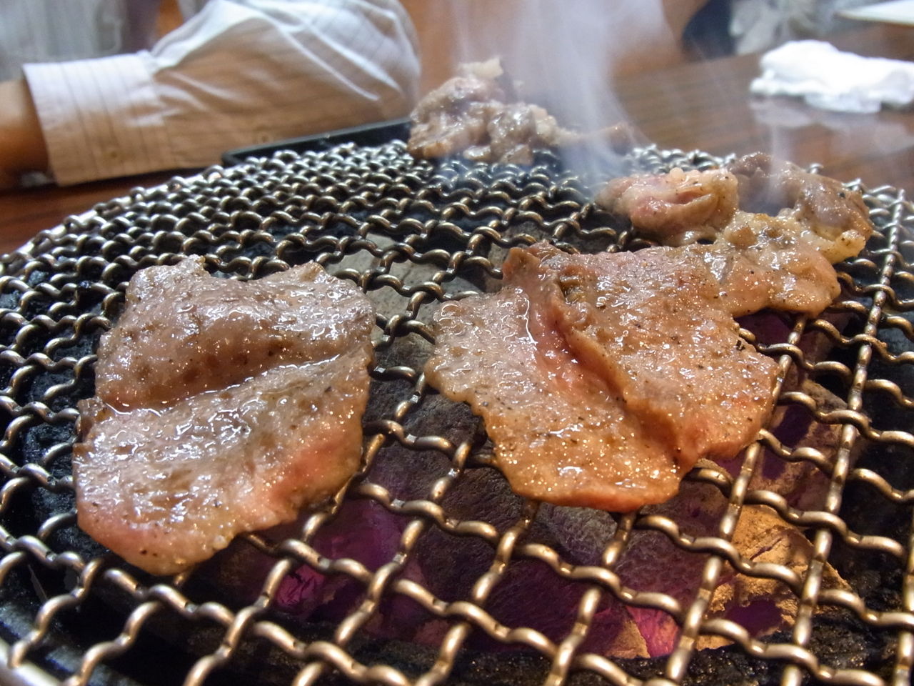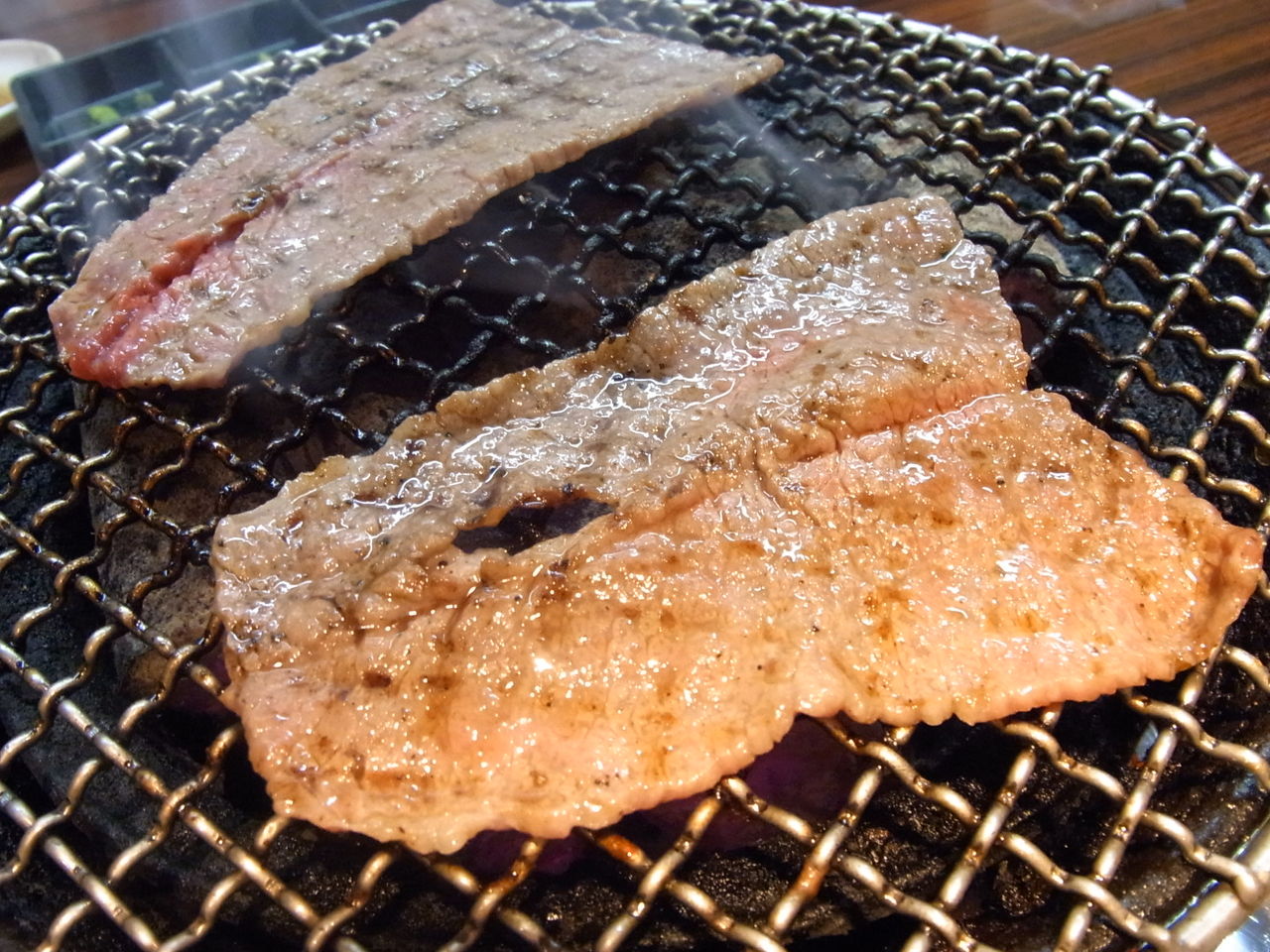 店名どおり、テーブルにセットされた、"七厘(=七輪)"の炭火で、肉を炙ることしばし・・・
