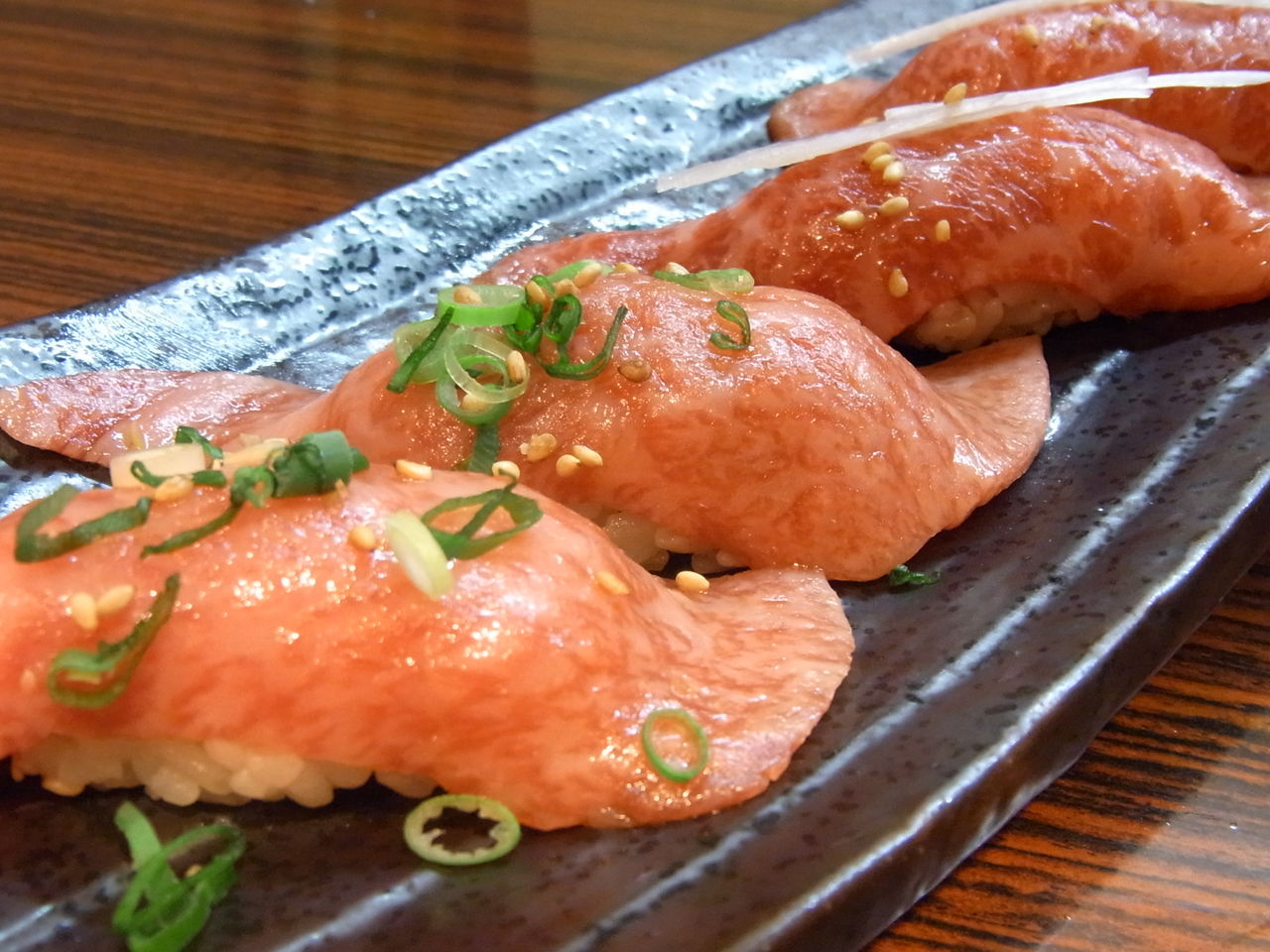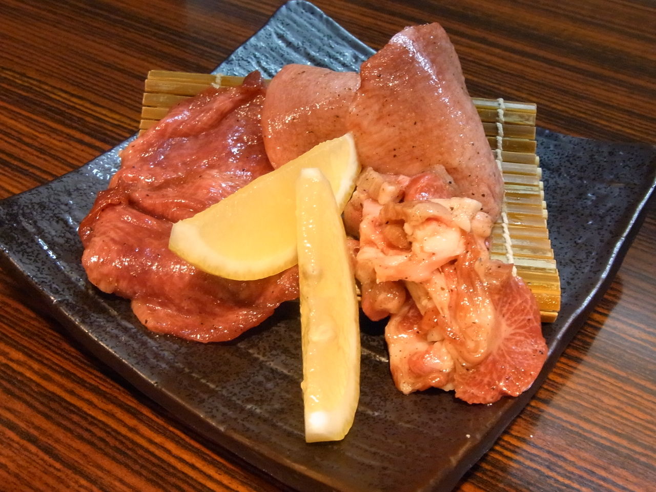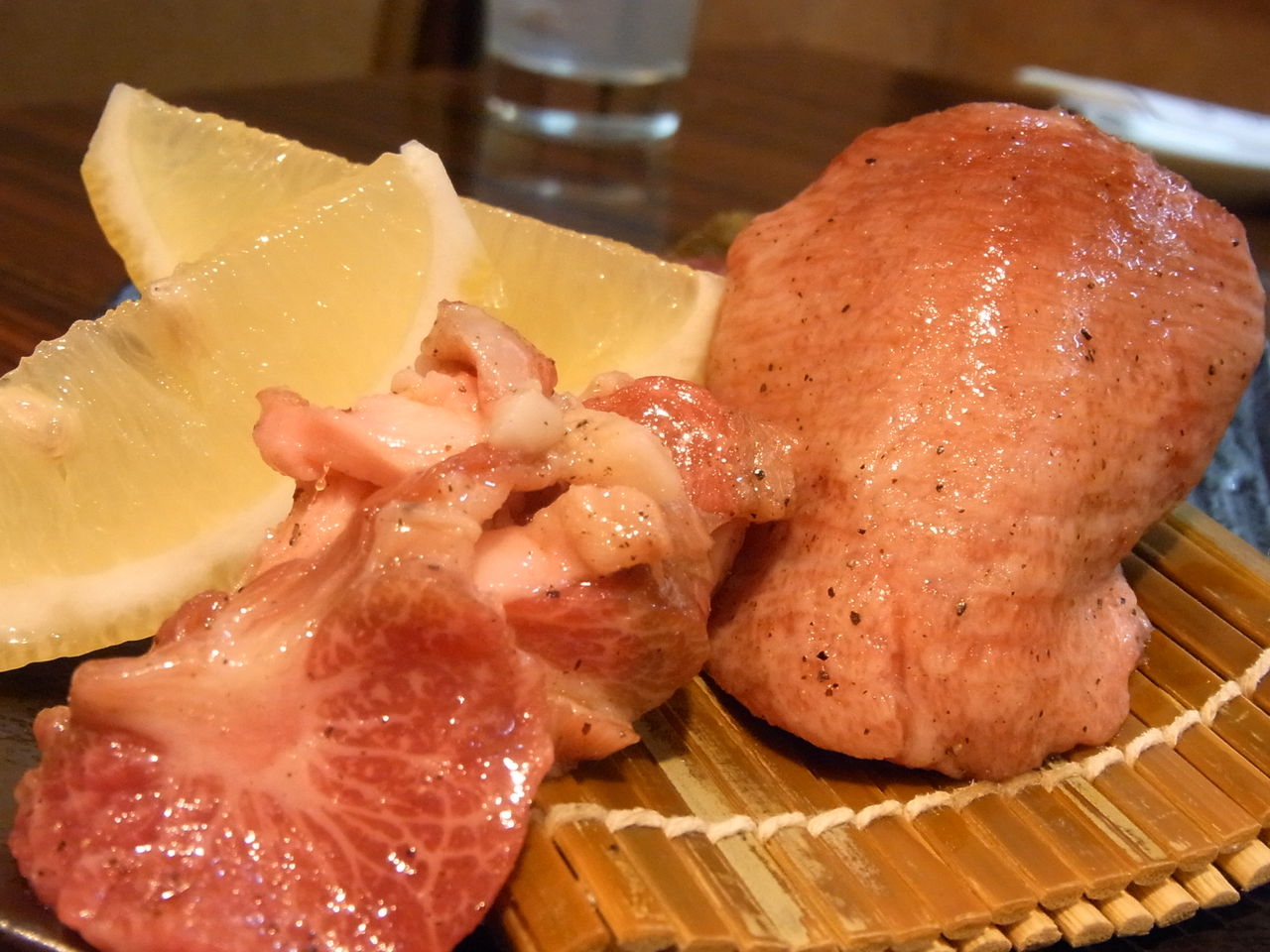 タンの、"根もと"、"先"、"スジ"の3種が盛られたものですが、各1枚ずつで4200円という、