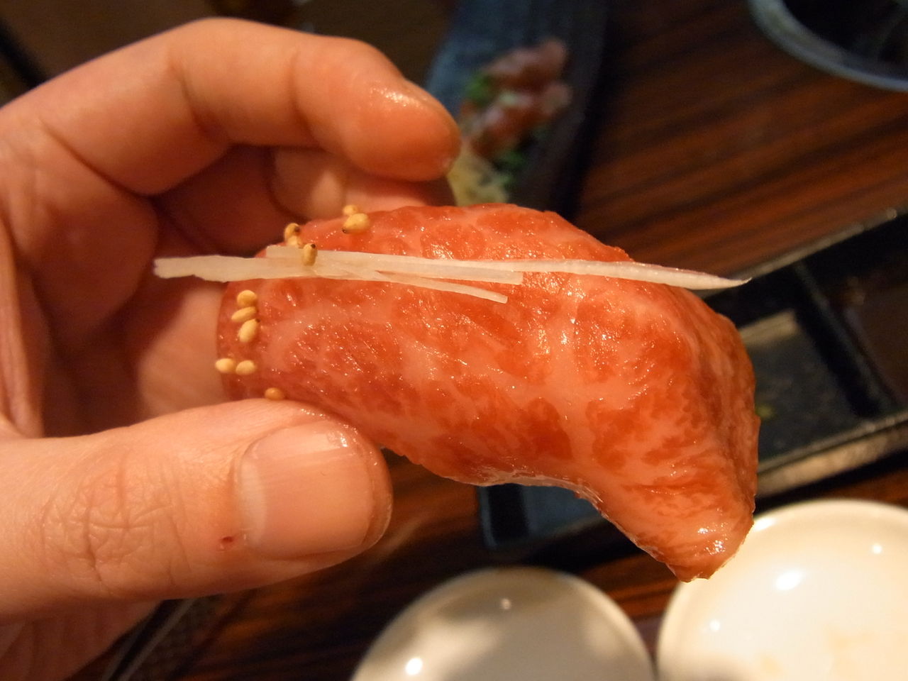 続いて、デブの好物のひとつ、ザブトン。 ロースの中でも、特に美しいサシの部位ですが・・・