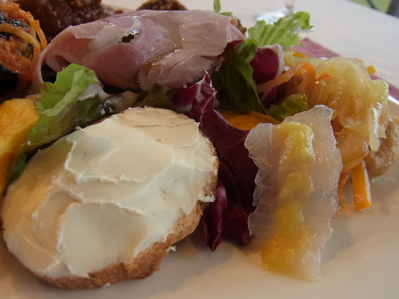 予想以上の大皿に乗った料理は、サラダ・カルパッチョ・ハム・チーズなどの前菜から・・・