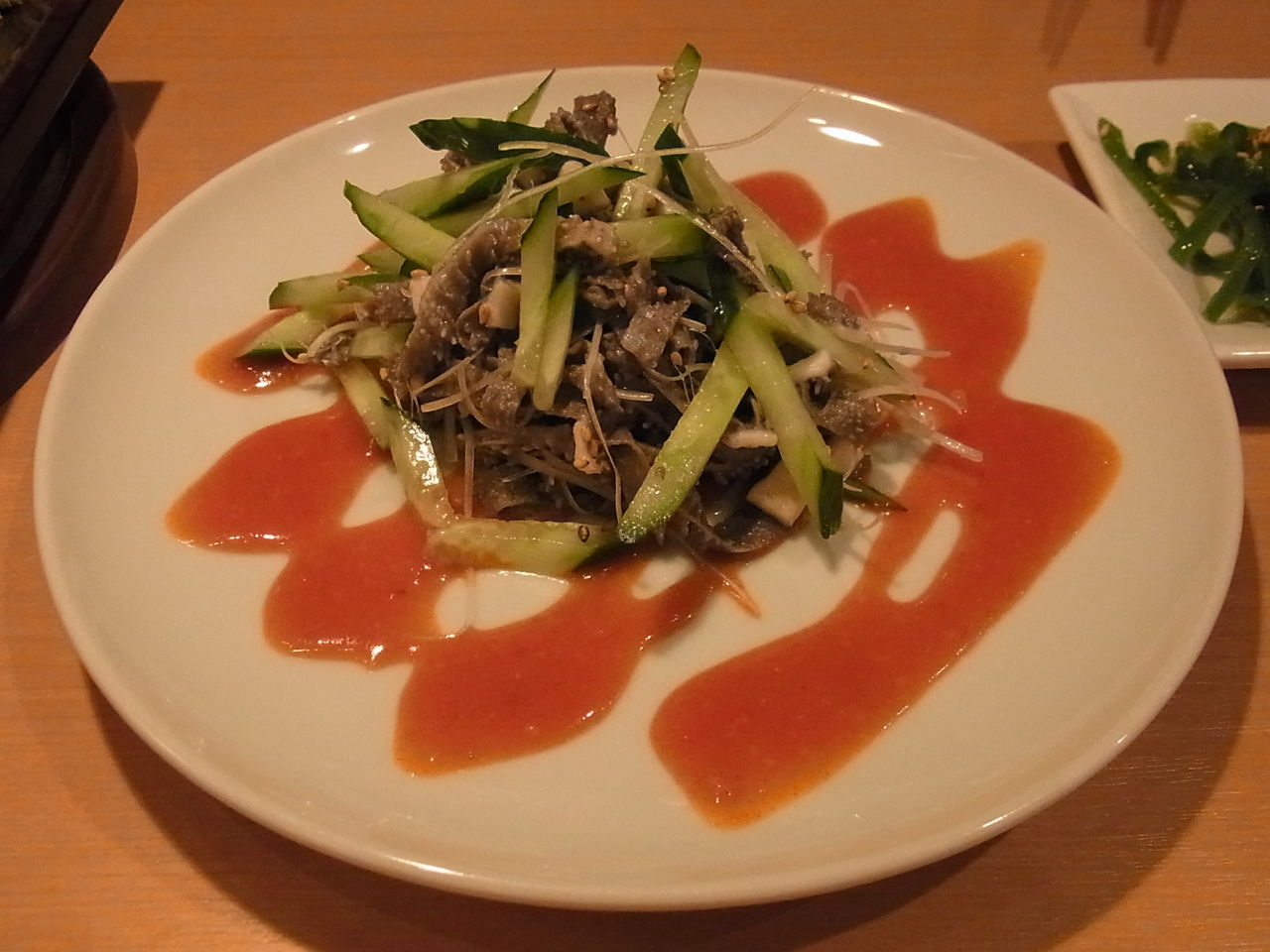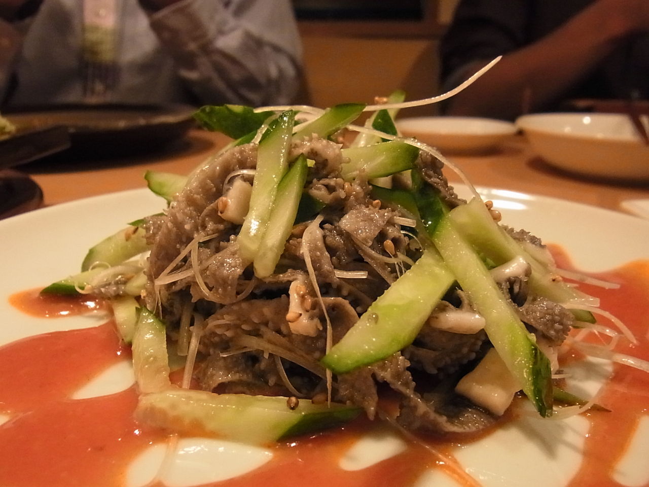 キュウリ&白髪ネギと和えられたセンマイ刺しは、オレンジ色の酢味噌ソースとともに。
