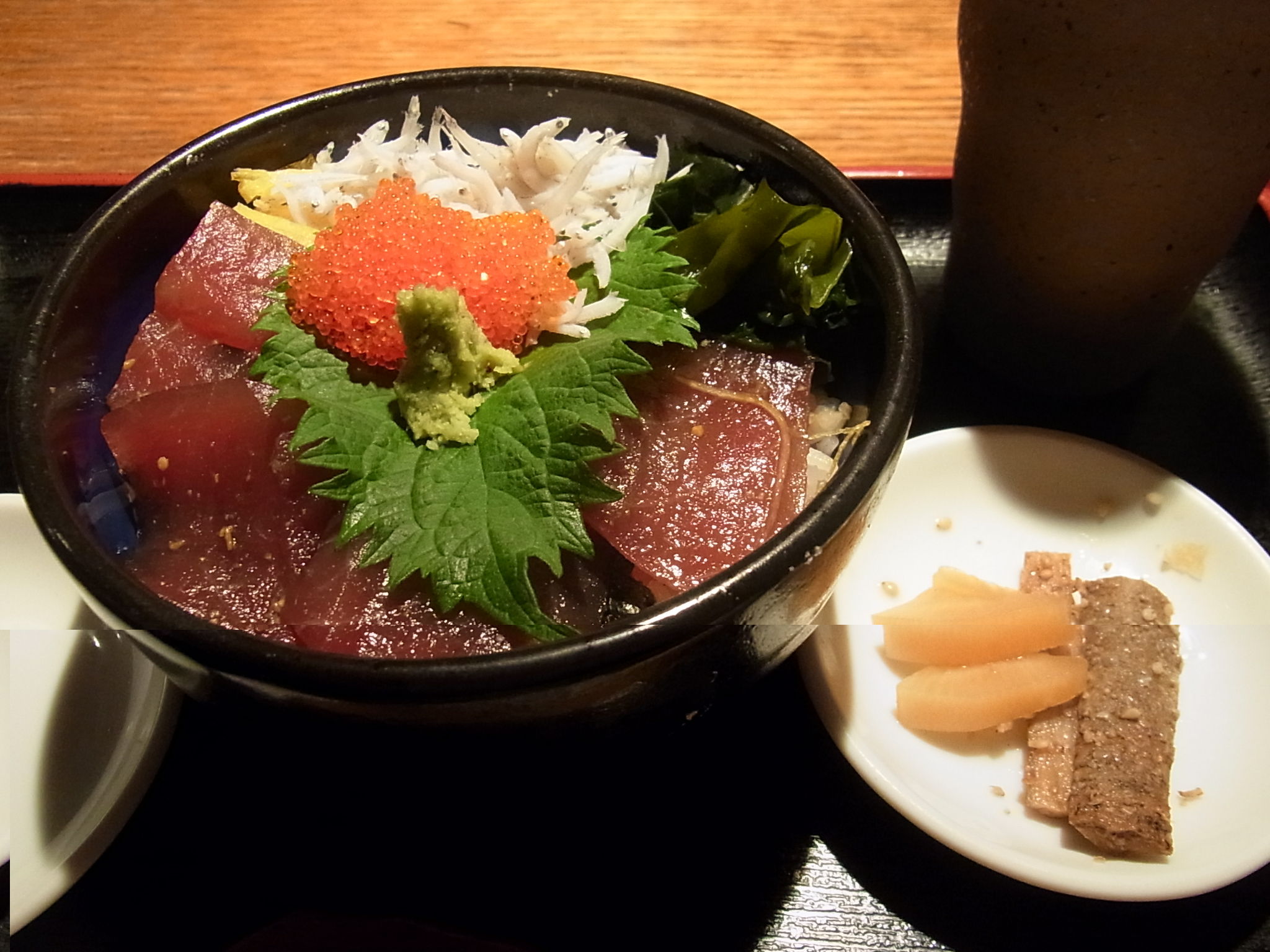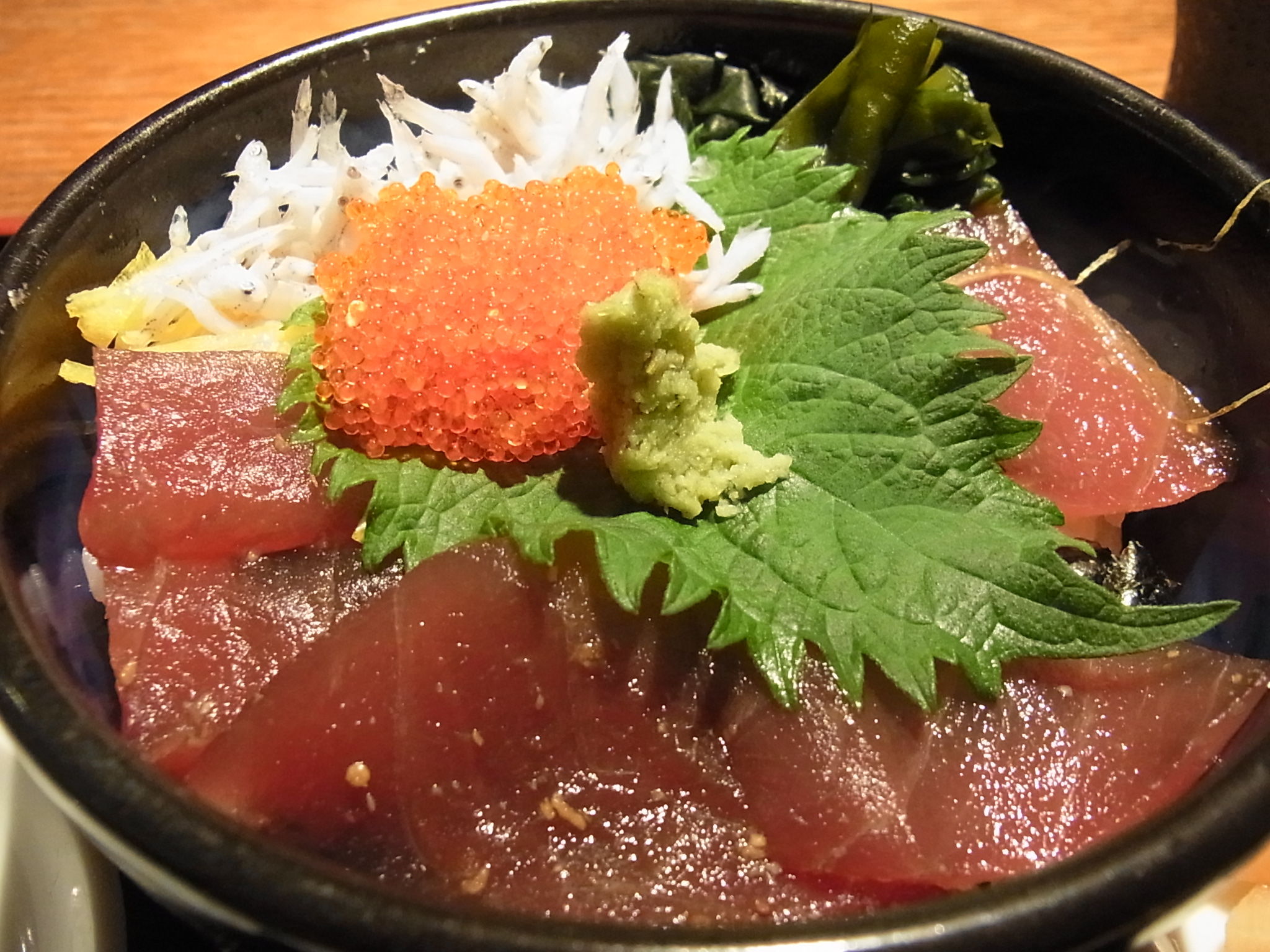 ミニ海鮮丼も追加! 酢飯のうえに、ヅケマグロ、トビコ、シラス、錦糸卵がオンされた丼♪