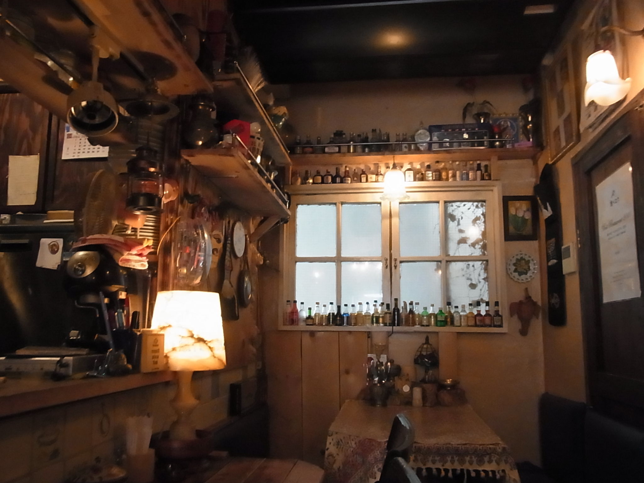 1軒家の木の扉を開けて入ってみると、民族装飾が置かれた、薄暗くてムードある雰囲気。