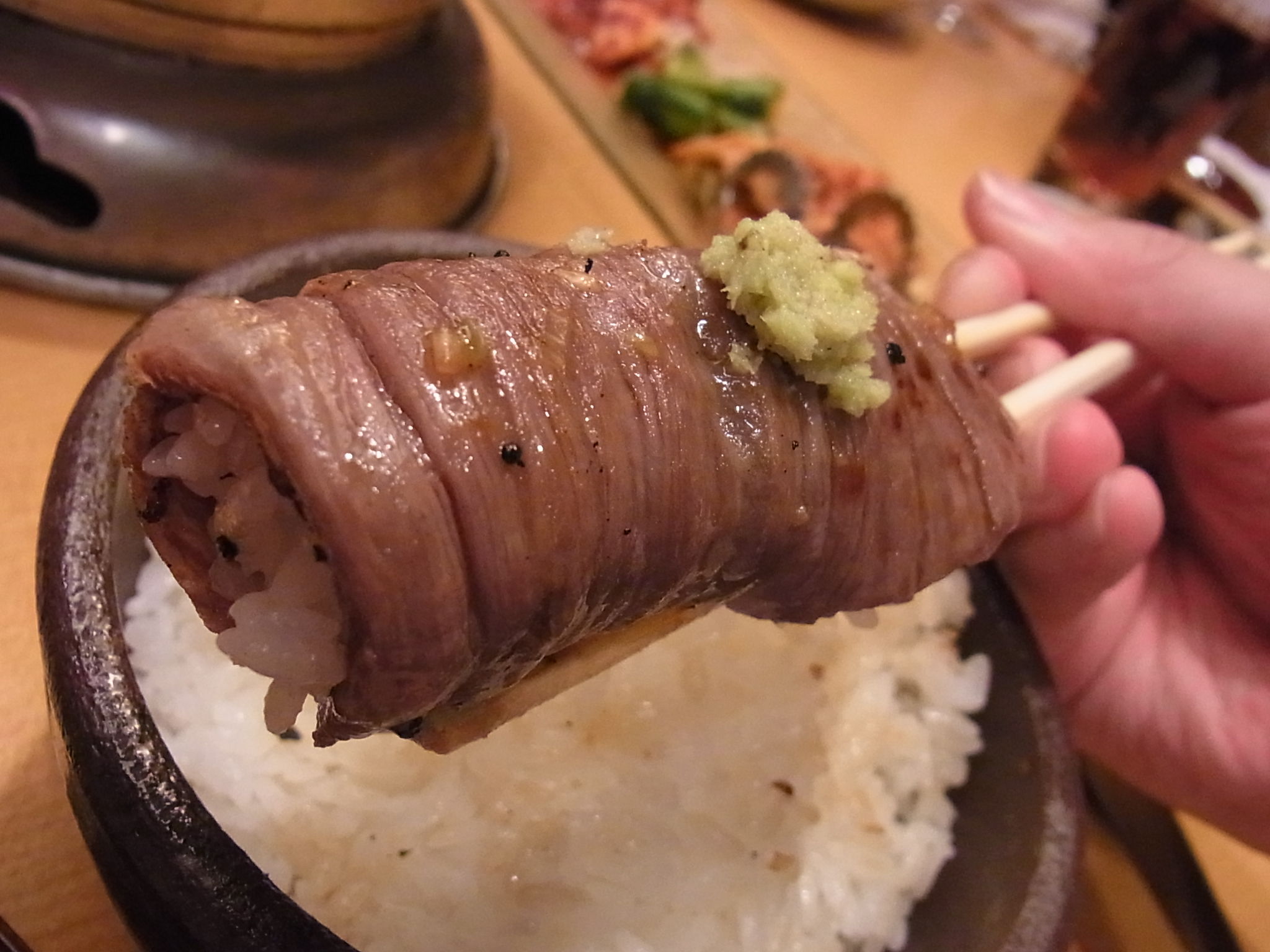 さっと湯引きしただけの赤身肉は、ほぼ生に近い食感で、ニンニクチップとネギを巻きーの、