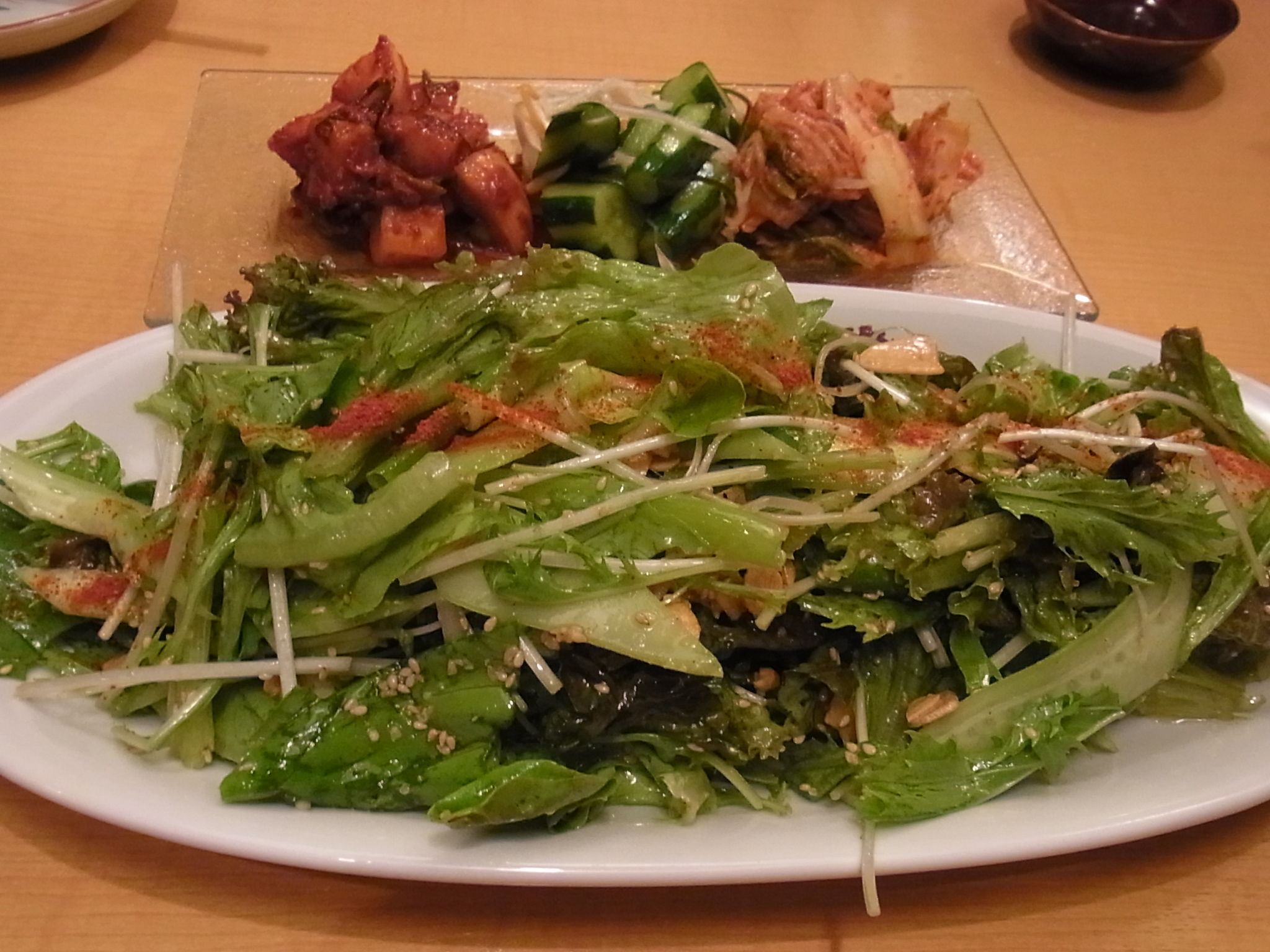 まずは、陶器に入ったビアーで乾杯しつつ、肉を攻める前の前菜としてサラダとキムチを。