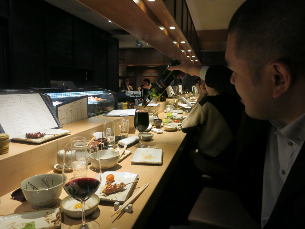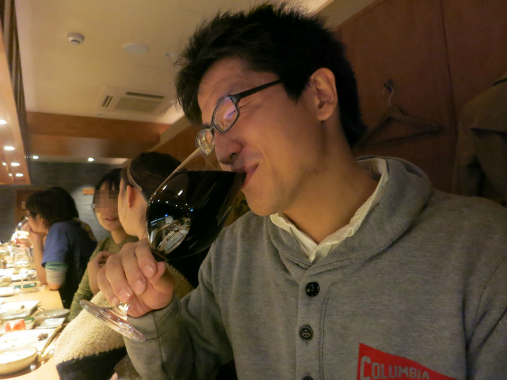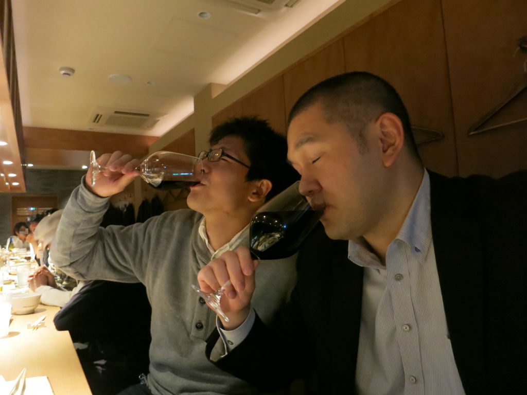 先輩のワイングラスに全て注ぎ(左上写真)、見事な責任転嫁を見せていたのでした(笑)