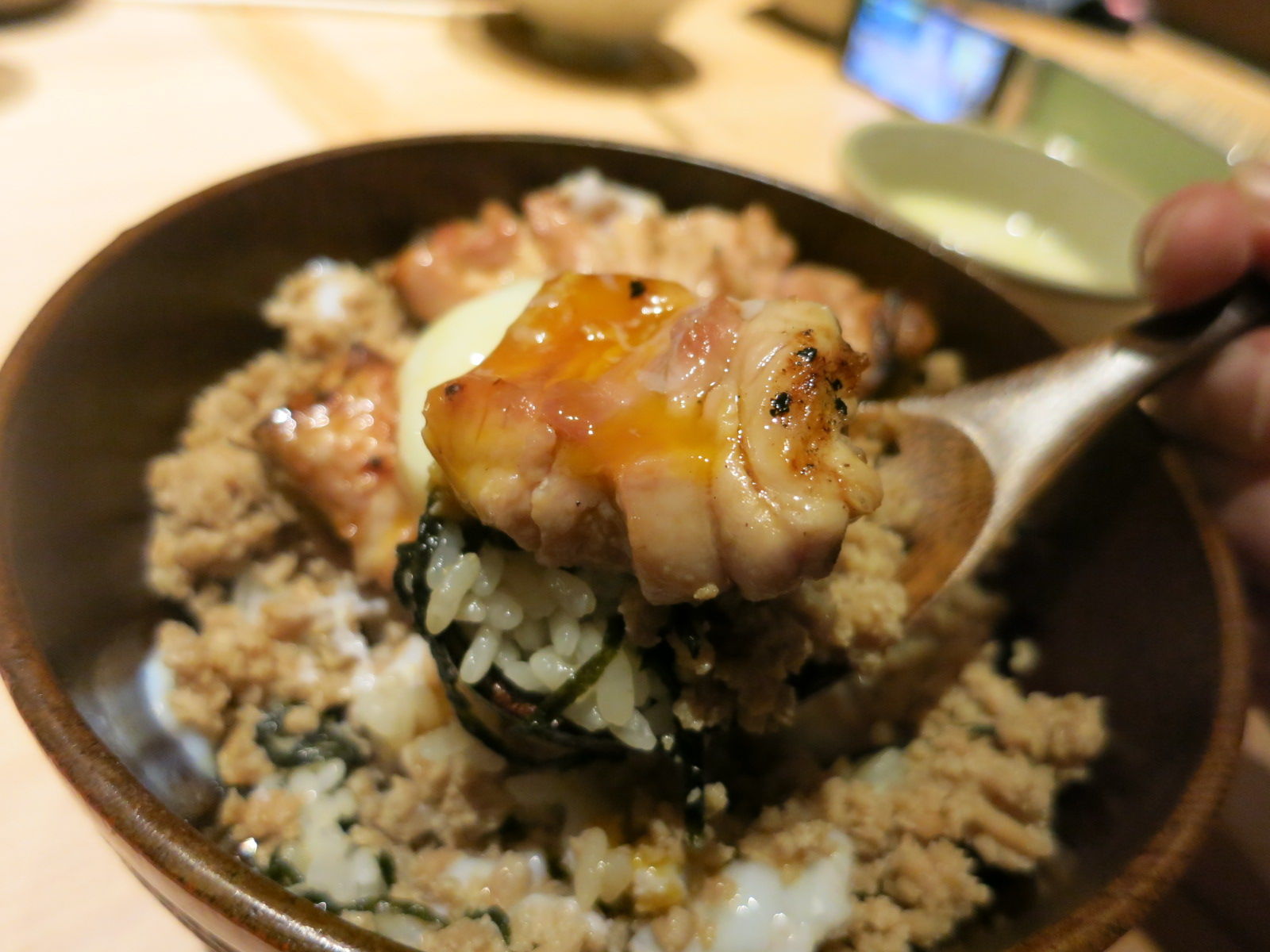 白米のうえに、鶏そぼろ、かしわ、温泉玉子をのせた、オンザライサー歓喜の逸品は…