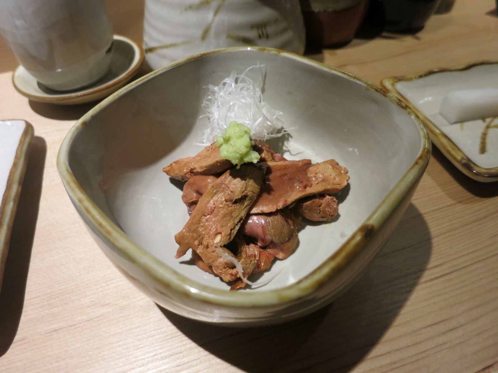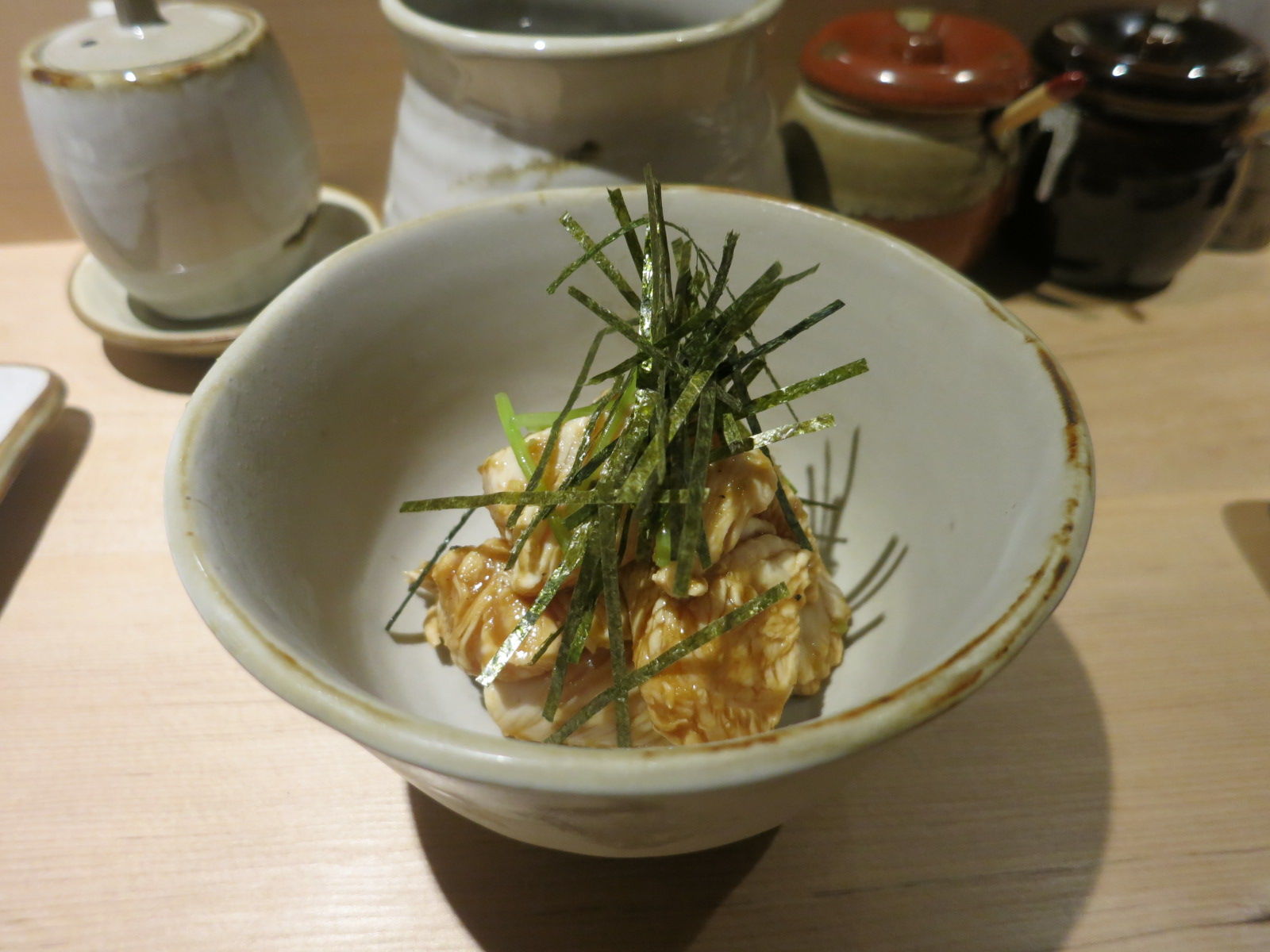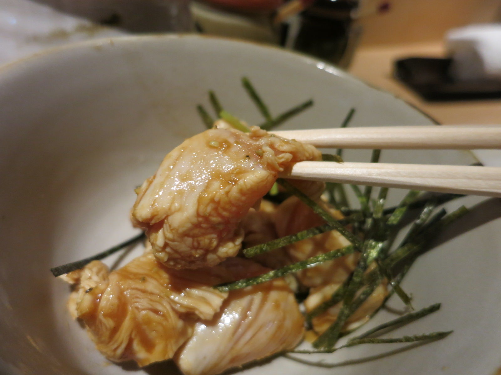 やはり焼鳥屋では定番のとりわさ(鶏の胸肉のわさび醤油和え)などをビールのお供に。
