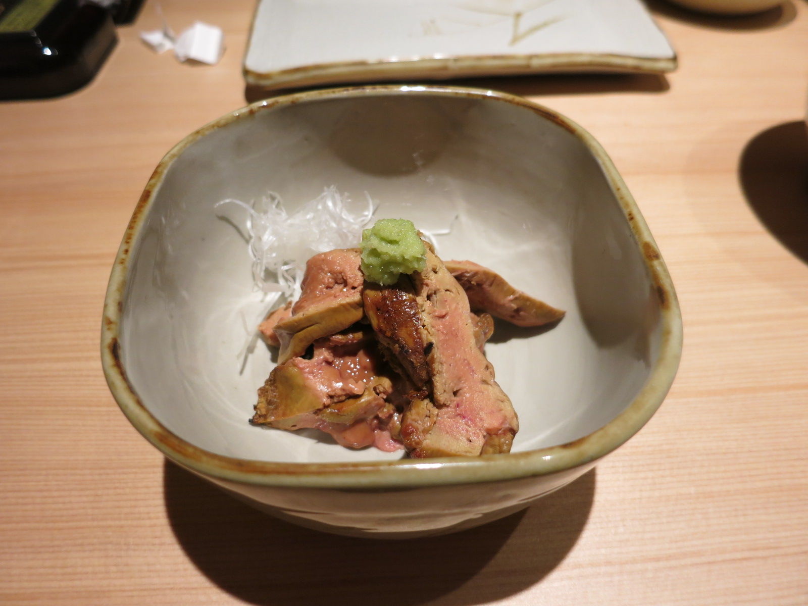 天然のフォアグラとも言われる稀少な白レバーは、表面に火入れをしたタタキで提供。
