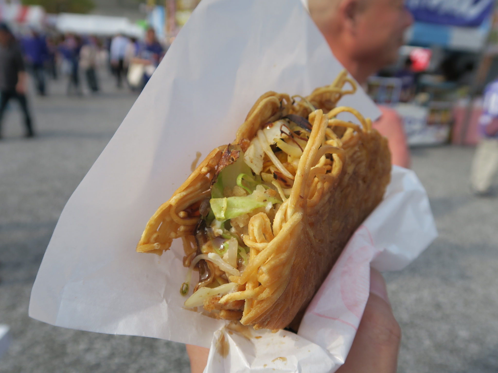 パリパリに焼き上げた麺で、豚肉や野菜をサンドして食べる「麺バーガー」的なもので、