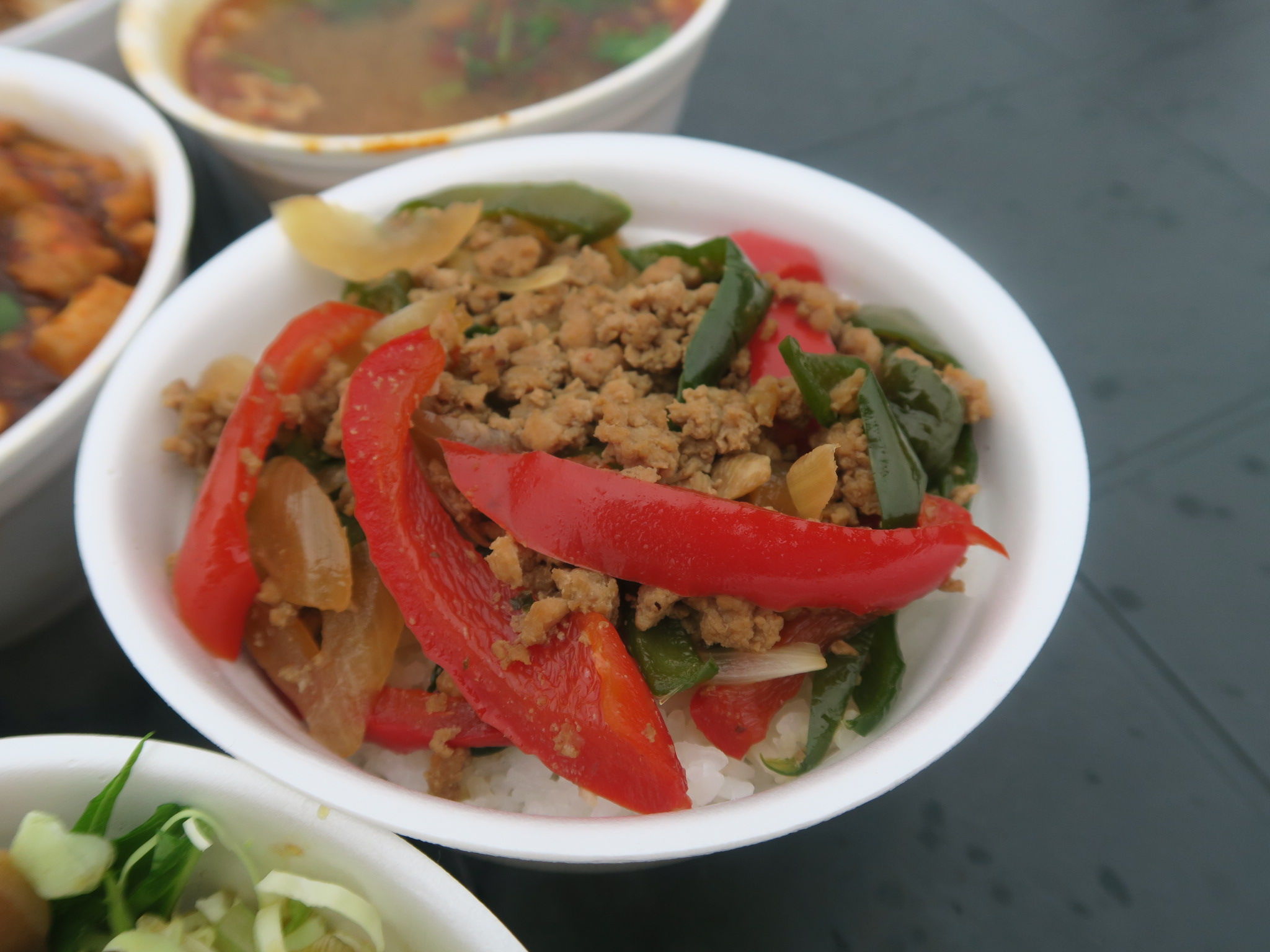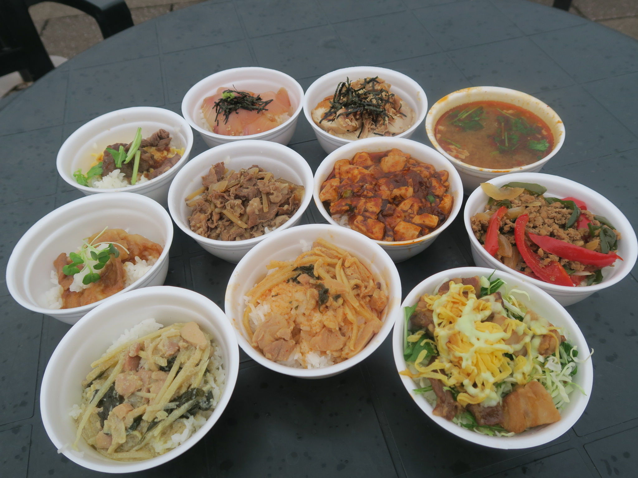 カラフルなタイ風のガパオ丼や、グリーンカレー丼もあったり、どれも国際色も豊か。