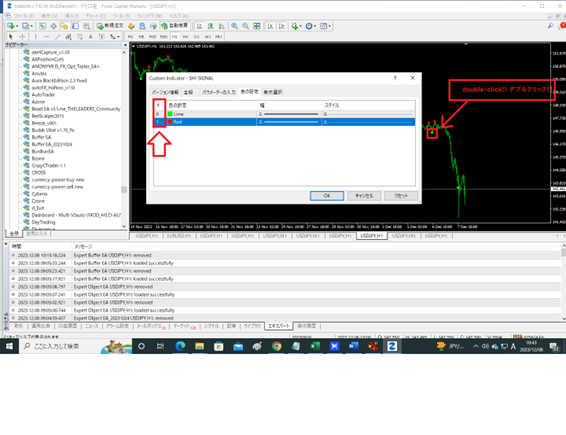 MT4上でサインツールの色の箇所をマウスでダブルクリックし続けると、設定が出て来るものが