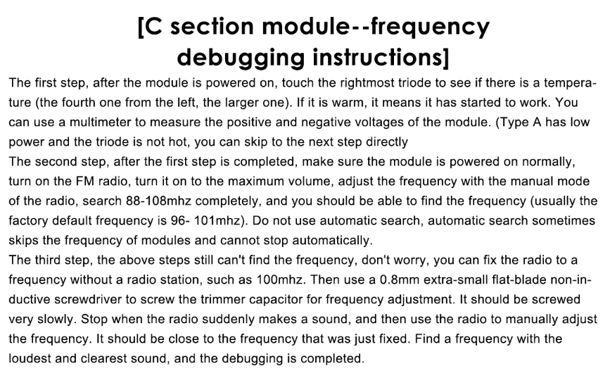 3 番目のステップでは、上記の手順でも周波数を見つけることができません。心配しないでください。ラジオ局のない周波数 (100mhz など) にラジオを固定できます。次に、0.8mmの極小無誘導ドライバー(当店で入手可能)を使用して、微調整コンデンサーの周波数調整を締めます。ネジを締めるのがとても遅いはずです。ラジオから突然音が鳴った場合は、ラジオを停止し、手動で周波数を調整してください。今ならその時だろう。固定周波数付近で周波数が見つかり、音が最もクリアになり、デバッグが完了します。