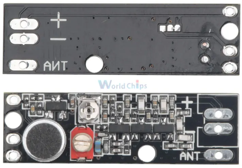 モジュールはAモデルをベースとした高周波パワーアンプで構成されています。出力が大きいため、その出力を発揮するにはより優れたアンテナを適合させる必要があります。75cm ロッドアンテナまたは 1mm 厚のエナメル線を使用して基板に直接はんだ付けすることをお勧めします。