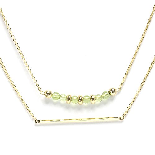 エレガントなレイヤードタイプのネックレス。小振りなペリドットと、シンプルなゴールドプレートの組み合わせが大人っぽい女性らしらをアピール。普段着のコーデにも上質感をプラスしてくれるおすすめアイテム。