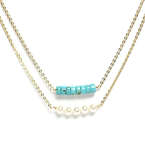エメラルドグリーンが美しいハウライトターコイズとクリスタルパールの2連のネックレス。普段のコーディネートにスパイスを与え、リラックスした雰囲気のコーデにはぴったり。レイヤードタイプのチェーンで、1本のネックレスで重ね付けスタイルが楽しめるデザインが人気。