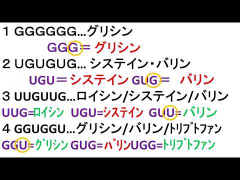 動画中の1~4のような人工RNAを用いたときの結果から、指定するアミノ酸の種類を推定してみましょう。