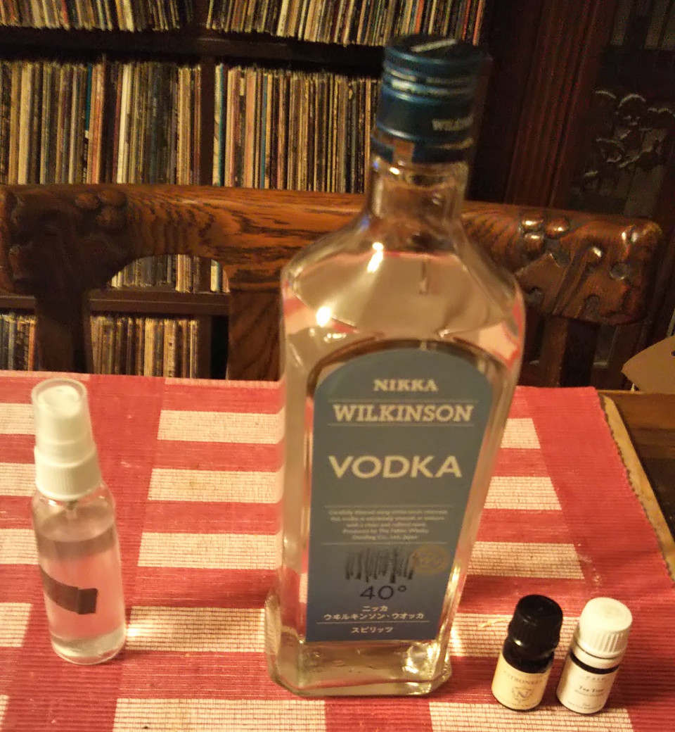 写真は、植物の精油(小瓶)とウォッカ(アルコール度数40)を混ぜて、スプレー容器に入れた様子です。