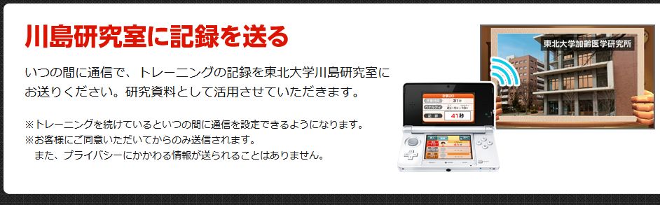 3DS「鬼トレ」の公式サイトで、今回のソフトには、いつの間に通信で、トレーニングの記録を、東北大学川島研究室に送ることが出来るようになっていることが紹介されています。
