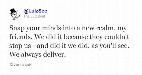 Bethesda Softworksがサイバー攻撃を受けた6月12日,LulzSecのリーダーと思われる人物が,Twitterを通じて「彼らには俺達を止められないからやったまでだ……,俺達はいつも(攻撃を)成功させる」(Snap your minds into a new realm, my friends. We did it because they couldn't stop us - and did it we did, as you'll see. We always deliver.)とツイートしている