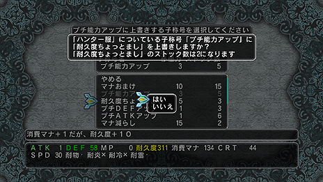 子称号『DEFアップ』『プチATKアップ』『耐久度ちょっとまし』がついている装備品なら『剣の威力アップして、 DEFアップ』『剣の威力アップして、プチATKアップ』『剣の威力アップして、耐久度ちょっとまし』という3つメリットが装備することで得られます。