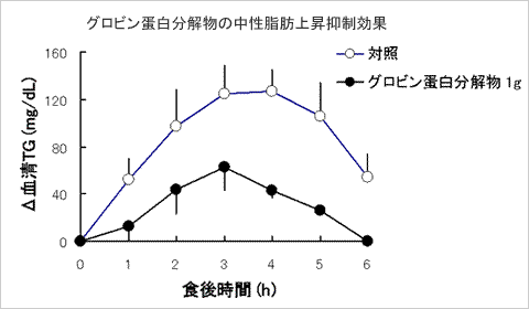 グロビン蛋白分解物には、メタボリックシンドロームの予防・治療に利用できる食品素材として大注目の成分です。特にグロビンペプチド摂取によって食後の中性脂肪の上昇は約 60% 抑制されたという臨床データもあります。