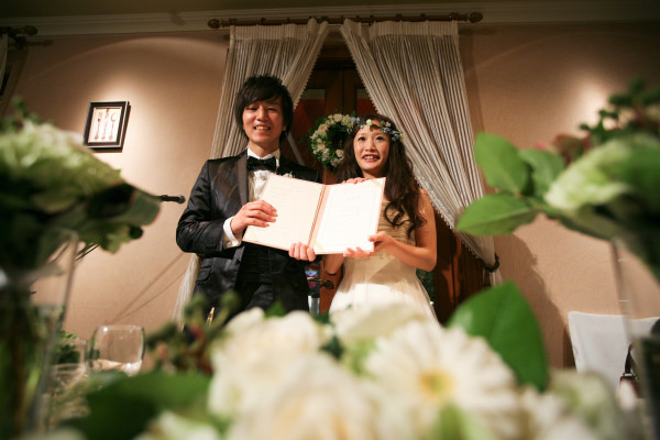 日本で古くから行われてきた結婚式で、床の間の前で三々九度を行っていた「祝言」との共通点も多いため、日本らしい内容だとも言えます。