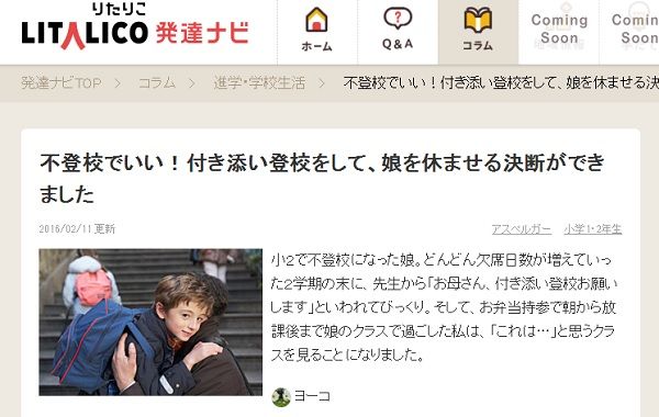 発達ナビのコラムが掲載されました。「付き添い登校について」LITALICOの発達ナビで執筆した不登校でいい!付き添い登校をして、娘を休ませる決断ができましたが掲載されました。付き添い登校は私が悩まされて、ネットで検索しまくった出来事なのでなんだか感無量です。おひるねウサギ~不登校かまへんかまへんマイペース♪には大変お世話になりました。付き添い登校について存分に語っていますので、ぜひ読んでみて今の学校の実態にびっくりしてください。