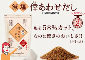 | 「塩分が気になる・・・」という方でも安心!旨みとしっかりとした味わいで、赤ちゃんからご年配の方まで安心・ご満足いただけます。食塩は一切使わず、素材本来が持つ塩分のみ。おいしくて体に優しい「減塩倖あわせだし」をぜひこの機会にお試しください。 |